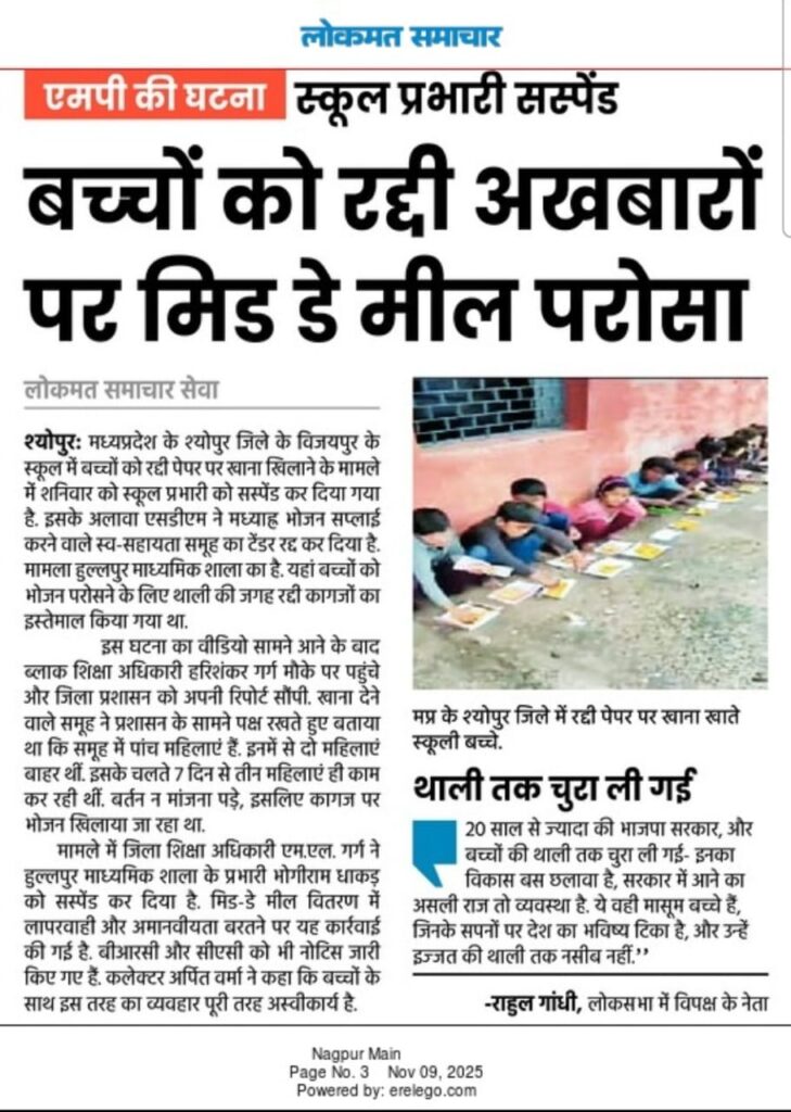 बच्चों को रद्दी अखबारों पर मिड डे मील परोसा, स्कूल प्रभारी सस्पेंड