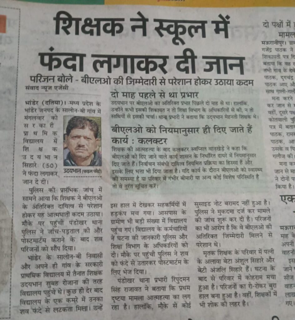 शिक्षक ने स्कूल में फंदा लगाकर दी जान परिजन बोले – बीएलओ की जिम्मेदारी से परेशान होकर उठाया कदम