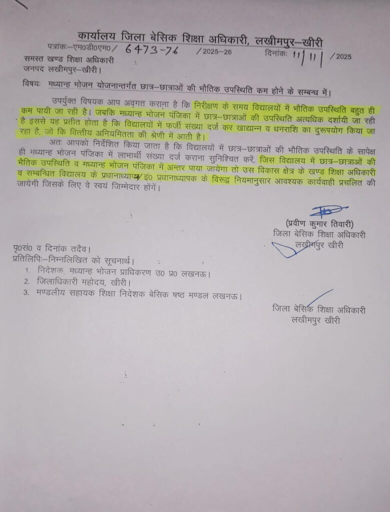 अतः आपको निर्देशित किया जाता है कि विद्यालयों में छात्र-छात्राओं की भौतिक उपस्थिति के सापेक्ष ही मध्यान्ह भोजन पंजिका में लाभार्थी संख्या दर्ज कराना सुनिश्चित करें, जिस विद्यालय में छात्र-छात्राओं की भैतिक उपस्थिति व मध्यान्ह भोजन पंजिका में अन्तर पाया जायेगा तो उस विकास क्षेत्र के खण्ड शिक्षा अधिकारी व सम्बन्धित विद्यालय के प्रधानाध्यापक इं० प्रधानाध्यापक के विरूद्ध नियमानुसार आवश्यक कार्यवाही प्रचलित की जायेगी जिसके लिए वे स्वयं जिम्मेदार होंगें।