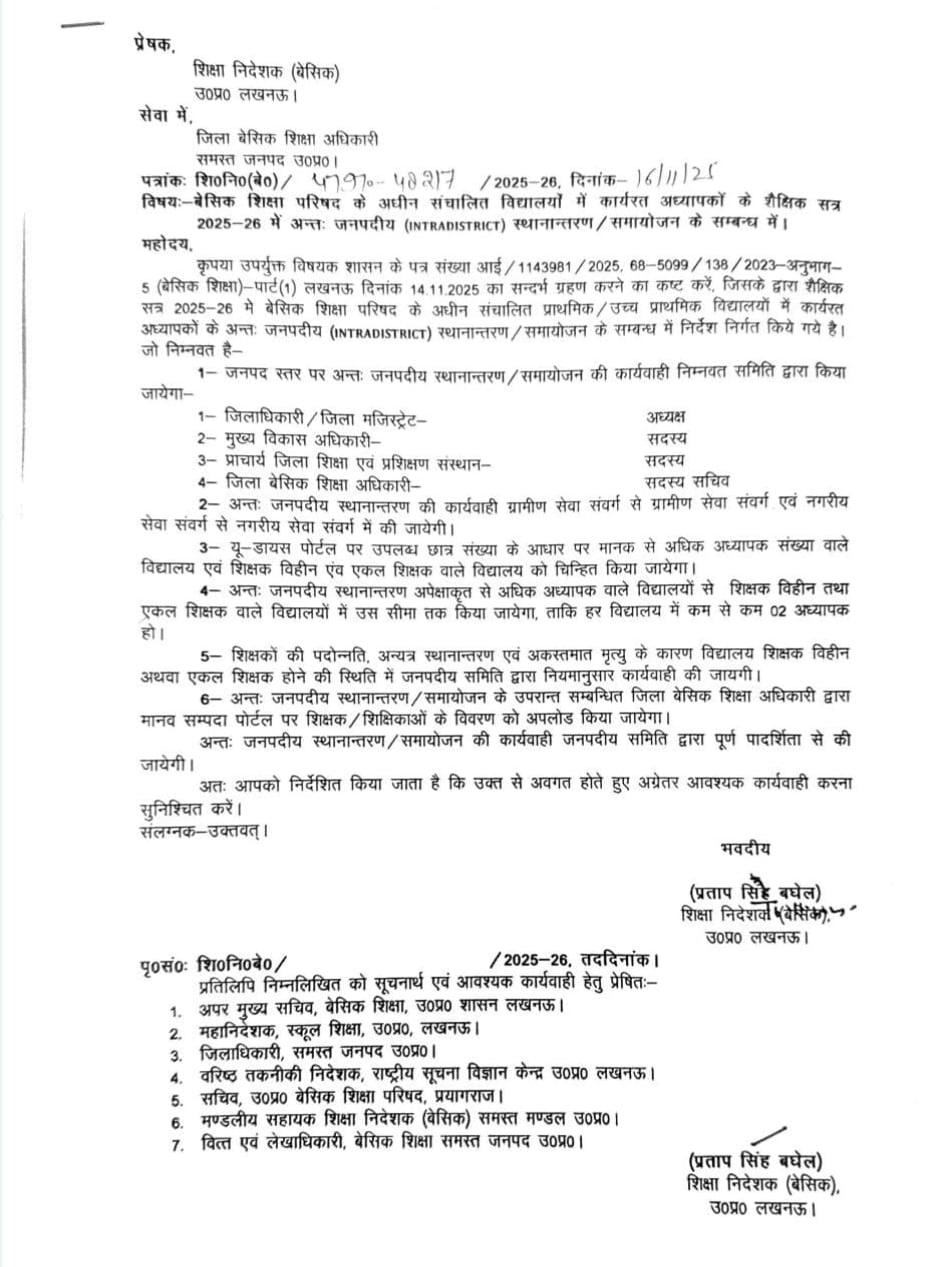बेसिक शिक्षा परिषद के अधीन संचालित विद्यालयों में कार्यरत अध्यापकों के शैक्षिक सत्र 2025-26 में अन्तः जनपदीय (INTRADISTRICT) स्थानान्तरण / समायोजन के सम्बन्ध में