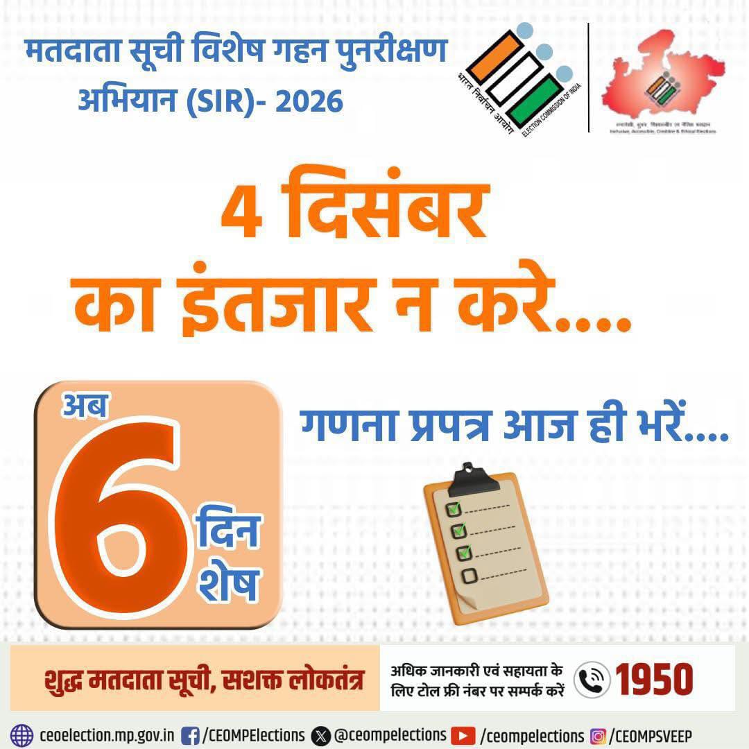 4 рджрд┐рд╕рдВрдмрд░ рдХрд╛ рдЗрдВрддрдЬрд╛рд░ рди рдХрд░реЗрдВ, рдЖрдЬ рд╣реА рдЕрдкрдирд╛ SIR рдЧрдгрдирд╛ рдкреНрд░рдкрддреНрд░ рднрд░реЗ..рдЕрдм рд╕рд┐рд░реНрдл 6 рджрд┐рди рд╢реЗрд╖ рдмрдЪреЗ рд╣реИрдВред