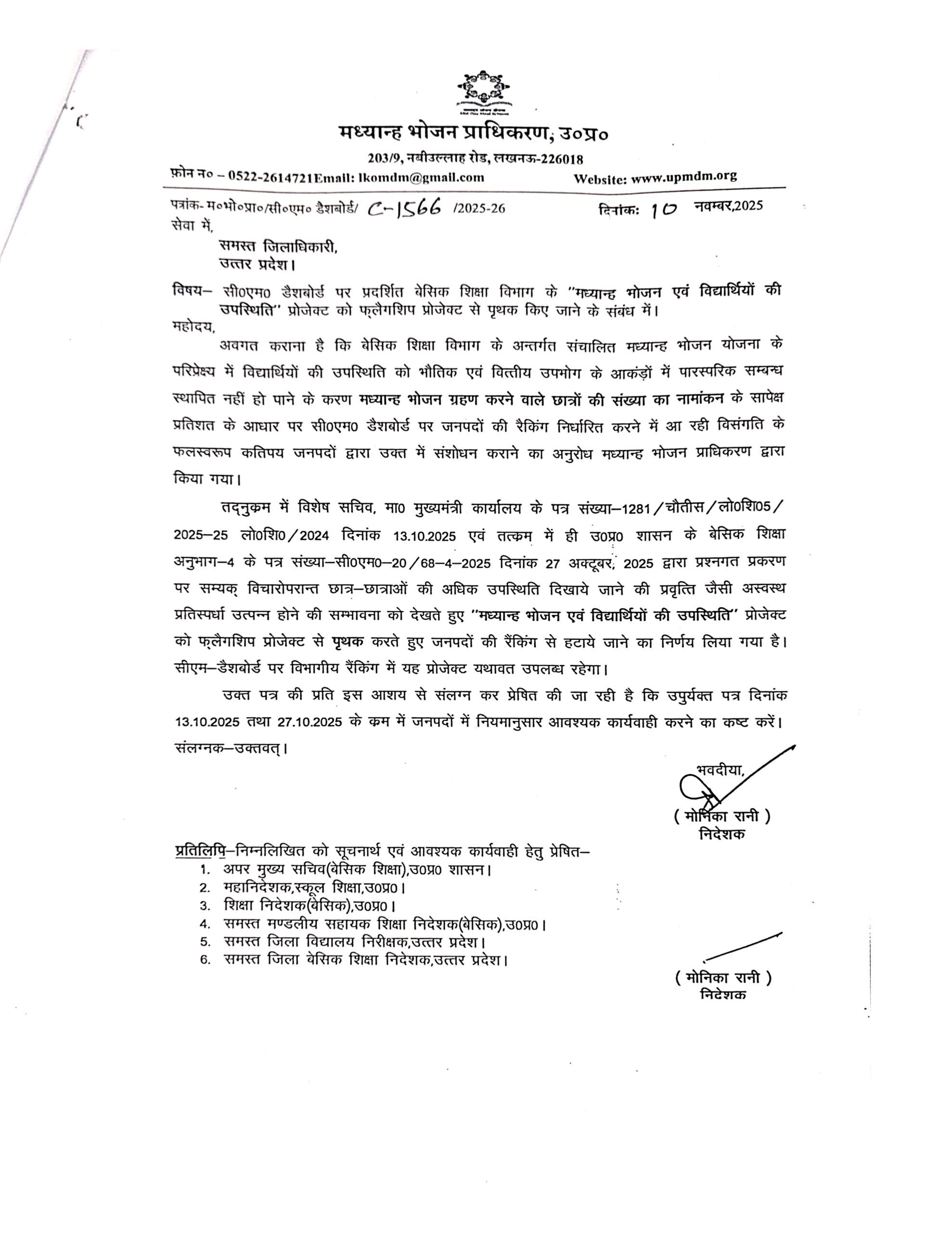 सी०एम० डैशबोर्ड पर प्रदर्शित बेसिक शिक्षा विभाग के “मध्यान्ह भोजन एवं विद्यार्थियों की उपस्थिति” प्रोजेक्ट को फ्लैगशिप प्रोजेक्ट से पृथक किए जाने के संबंध में।