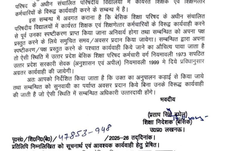 बेसिक शिक्षा परिषद के अधीन संचालित परिषदीय विद्यालयों में कार्यरत शिक्षक एवं शिक्षणेत्तर कर्मचारियों के विरुद्ध कार्यवाही के पहले उन्हें सुनवाई का पर्याप्त अवसर देने के संबंध में आदेश जारी