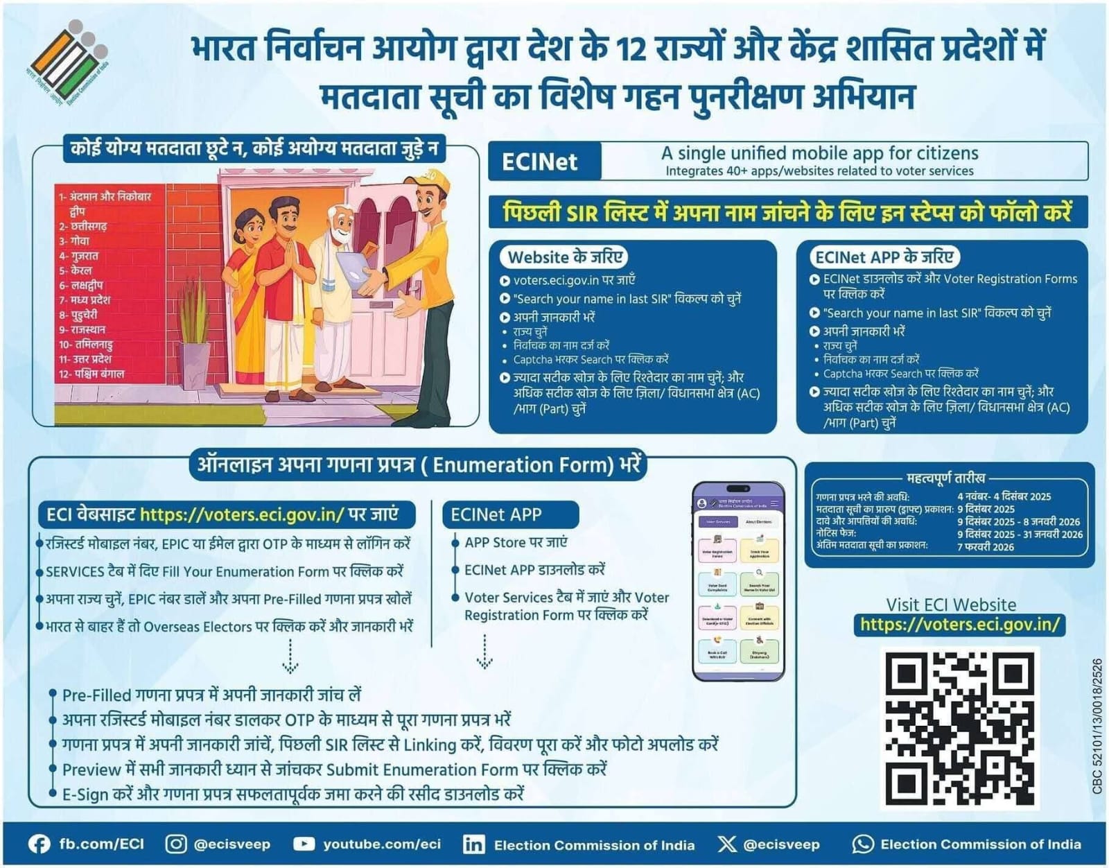 *📢 भारत निर्वाचन आयोग द्वारा देश के 12 राज्यों और केंद्र शासित प्रदेशों में मतदाता सूची का विशेष गहन पुनरीक्षण (SIR) अभियान चल रहा है…*