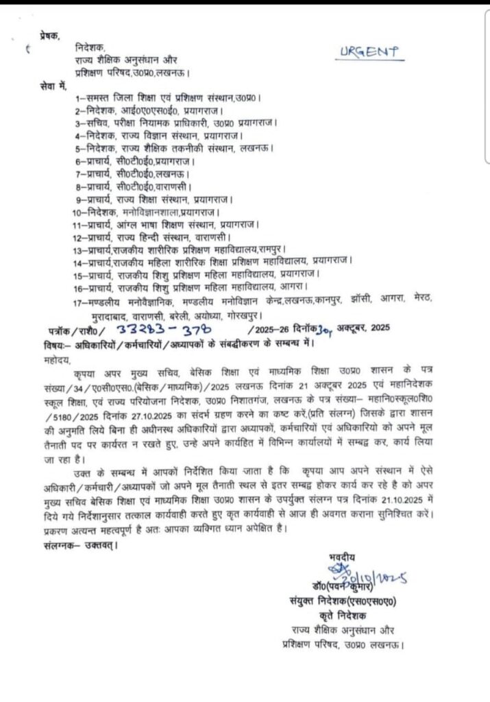 SCERT निदेशक द्वारा डायट व अन्य सभी प्रशिक्षण संस्थानों में अधिकारियों/कर्मचारियों/अध्यापकों का संबद्धिकरण निरस्त करने के संबंध में।