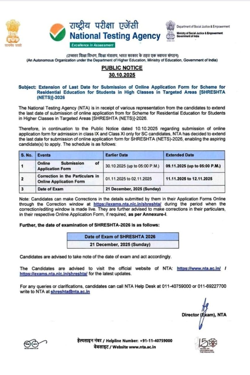 SHRESHTA (NETS)-2026 के लिए आवेदन तिथि 09.11.2025 तक बढ़ाई गई!