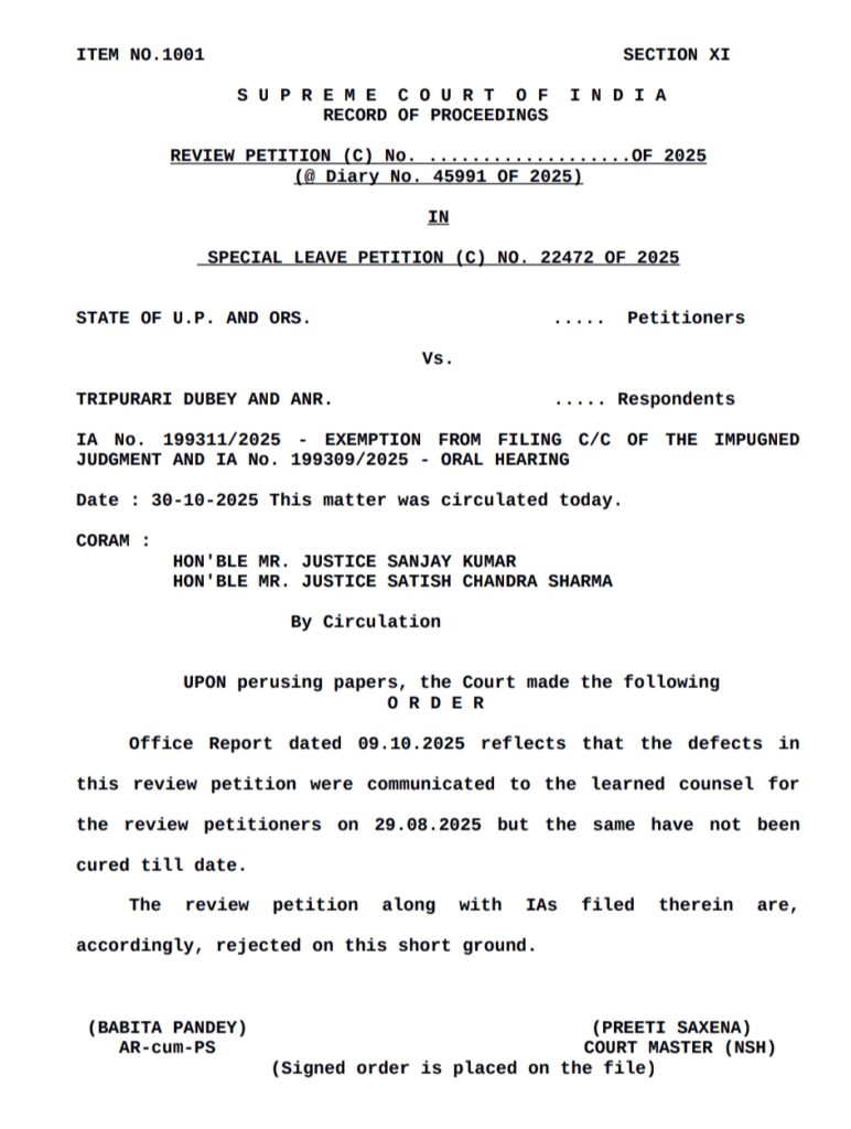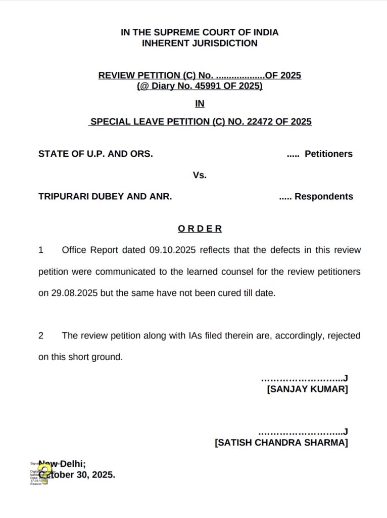 1. दिनांक 09.10.2025 की कार्यालय रिपोर्ट से यह स्पष्ट होता है कि इस पुनर्विचार याचिका (Review Petition) में पाई गई त्रुटियाँ/कमियाँ 29.08.2025 को पुनर्विचार याचिकाकर्ताओं के अधिवक्ता को सूचित कर दी गई थीं, परंतु आज तक उन त्रुटियों का निराकरण नहीं किया गया है।