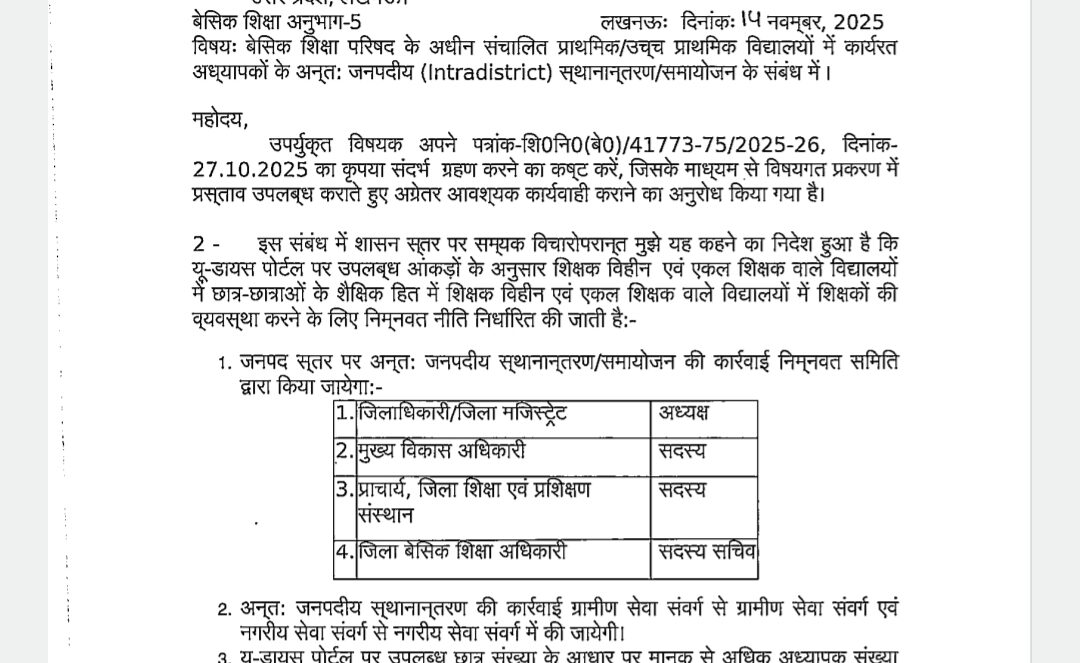 समायोजन 3.0: बेसिक शिक्षा परिषद के अधीन संचालित प्राथमिक/उच्च प्राथमिक विद्यालयों में कार्यरत अध्यापकों के अन्तः जनपदीय (Intradistrict) स्थानान्तरण/समायोजन के संबंध में