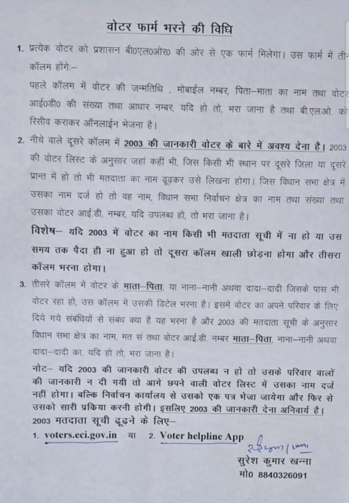 1. प्रत्येक वोटर को प्रशासन बी०एल०ओर० की ओर से एक फार्म मिलेगा। उस फार्म में तीन
