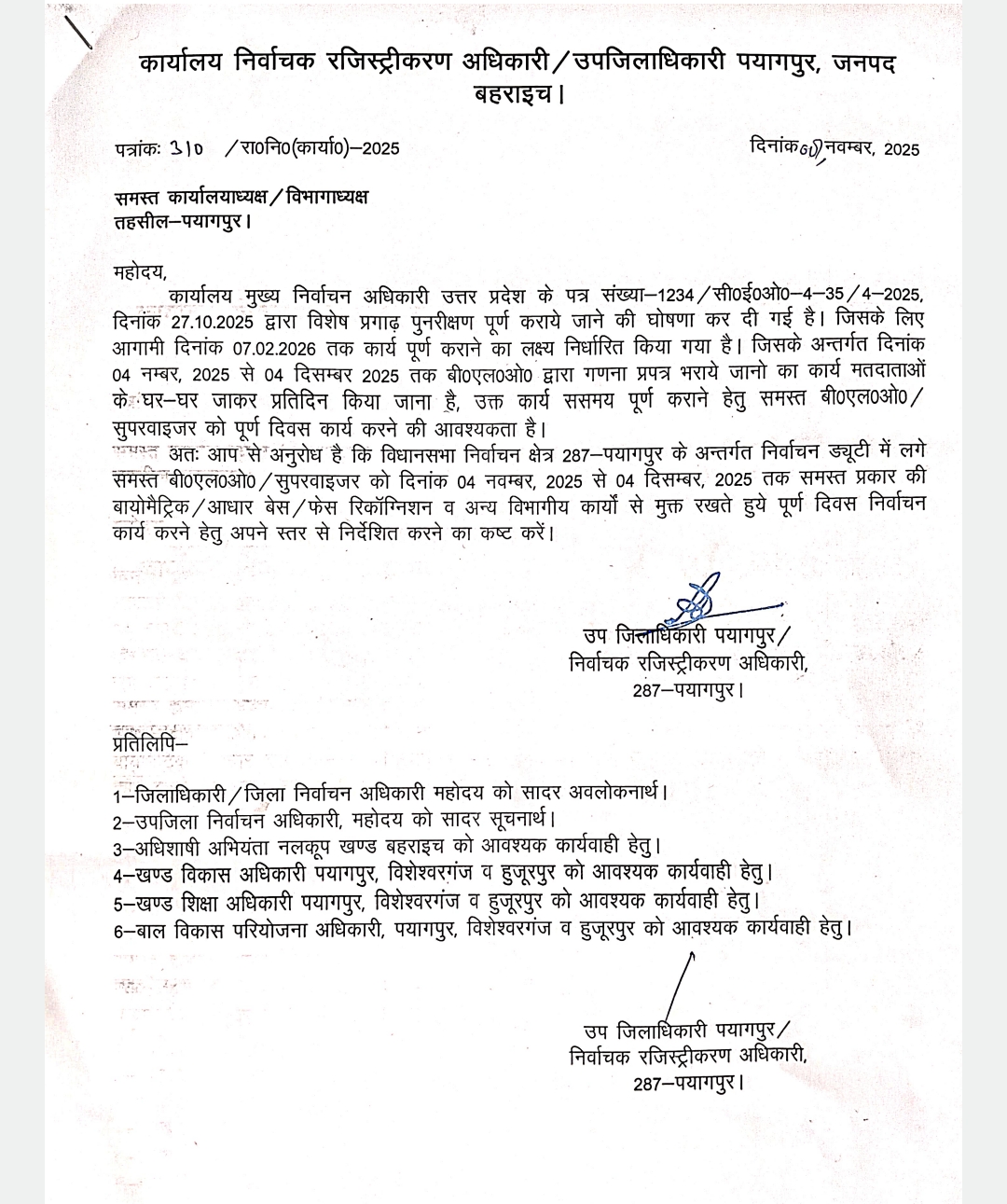 जिले के समस्त बीएलओ को 4 नवम्बर से 4 दिसंबर तक उप जिलाधिकारी द्वारा स्कूल से कार्य मुक्ति का आदेश जारी