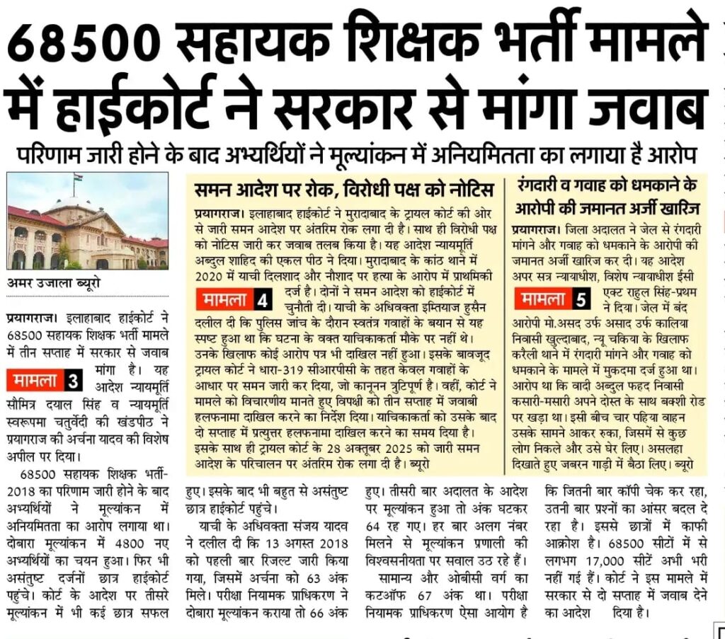 प्रयागराज। इलाहाबाद हाईकोर्ट ने 68500 सहायक शिक्षक भर्ती मामले में तीन सप्ताह में सरकार से जवाब मांगा है। यह सौमित्र दयाल सिंह व न्यायमूर्ति स्वरूपमा चतुर्वेदी की खंडपीठ ने प्रयागराज की अर्चना यादव की विशेष अपील पर दिया।