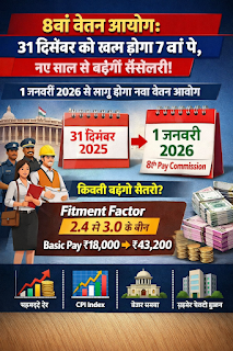 नई दिल्ली। साल 2025 के अंतिम दिनों के साथ ही देश में कई अहम वित्तीय बदलावों की तैयारी है। 1 जनवरी 2026 से नियमों में संभावित बदलावों के बीच केंद्रीय कर्मचारियों और पेंशनभोगियों की निगाहें खास तौर पर वेतन से जुड़ी बड़ी घोषणा पर टिकी हैं। वजह यह है कि सातवां वेतन आयोग 31 दिसंबर 2025 को अपना कार्यकाल पूरा करेगा और इसके बाद आठवें वेतन आयोग के लागू होने की प्रक्रिया शुरू होने की संभावना जताई जा रही है।