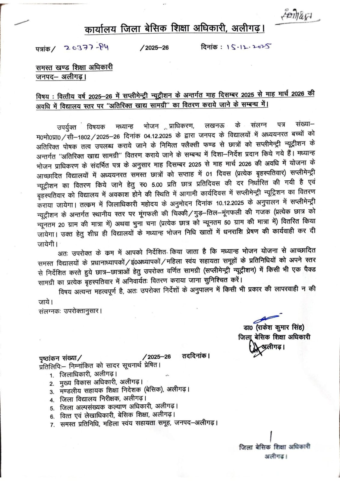 विद्यालय में माह दिसंबर 2025 से मार्च 2026 की अवधि में प्रत्येक बृहस्पतिवार को सप्लीमेंट्री न्यूट्रिशन का वितरण कराए जाने के संबंध में👆