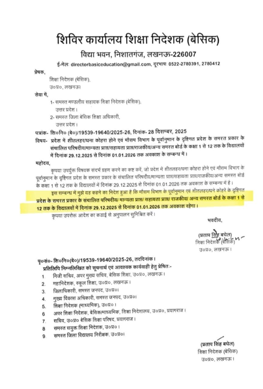 प्रदेश में शीतलहर/घना कोहरा होने एवं मौसम विभाग के पूर्वानुमान के दृष्टिगत प्रदेश के समस्त प्रकार के संचालित परिषदीय/मान्यता प्राप्त/सहायता प्राप्त/राजकीय/अन्य समस्त बोर्ड के कक्षा 1 से 12 तक के विद्यालय दिनांक 29.12.2025 से दिनांक 01.01.2026 तक बंद रहेंगे।