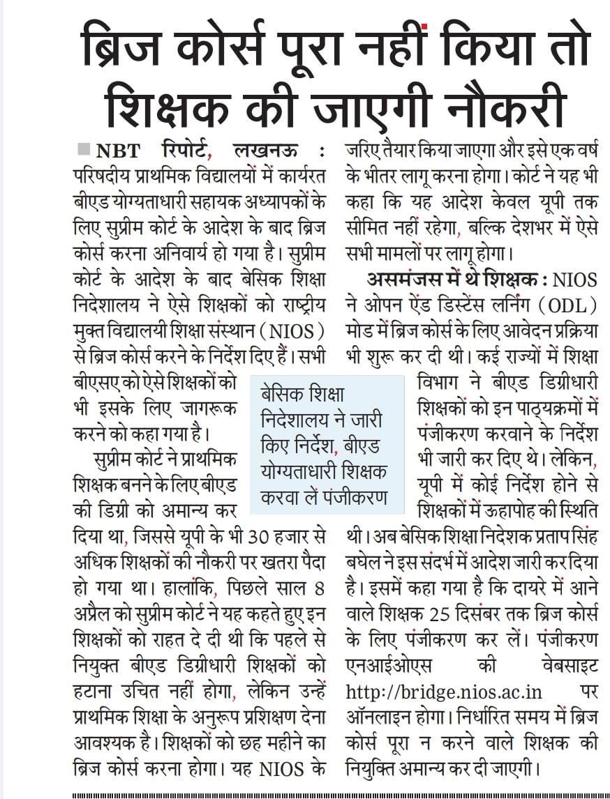 ने ओपन ऐंड डिस्टेंस लर्निंग (ODL) मोड में ब्रिज कोर्स के लिए आवेदन प्रक्रिया भी शुरू कर दी थी। कई राज्यों में शिक्षा विभाग ने बीएड डिग्रीधारी शिक्षकों को इन पाठ्यक्रमों में पंजीकरण करवाने के निर्देश भी जारी कर दिए थे। लेकिन, यूपी में कोई निर्देश होने से शिक्षकों में ऊहापोह की स्थिति थी। अब बेसिक शिक्षा निदेशक प्रताप सिंह बघेल ने इस संदर्भ में आदेश जारी कर दिया है। इसमें कहा गया है कि दायरे में आने वाले शिक्षक 25 दिसंबर तक ब्रिज कोर्स के लिए पंजीकरण कर लें। पंजीकरण एनआईओएस की वेबसाइट पर http://bridge.nios.ac.in ऑनलाइन होगा। निर्धारित समय में ब्रिज कोर्स पूरा न करने वाले शिक्षक की नियुक्ति अमान्य कर दी जाएगी।
