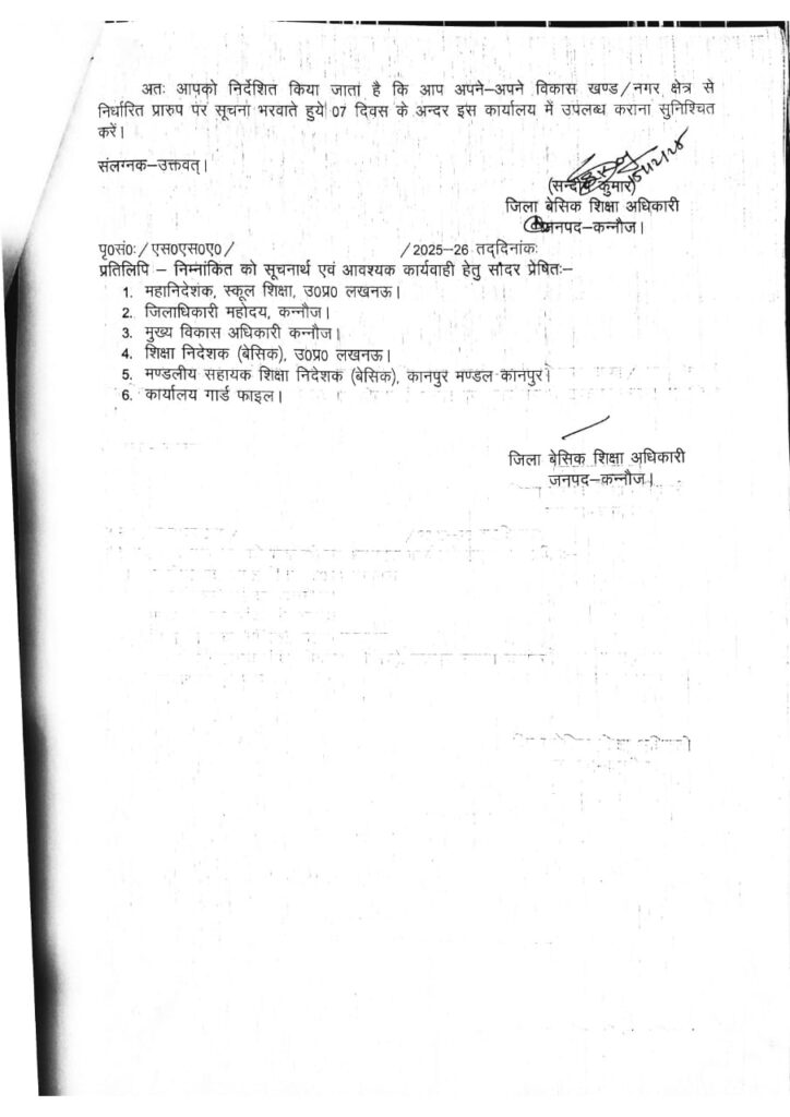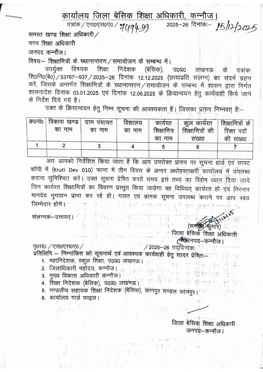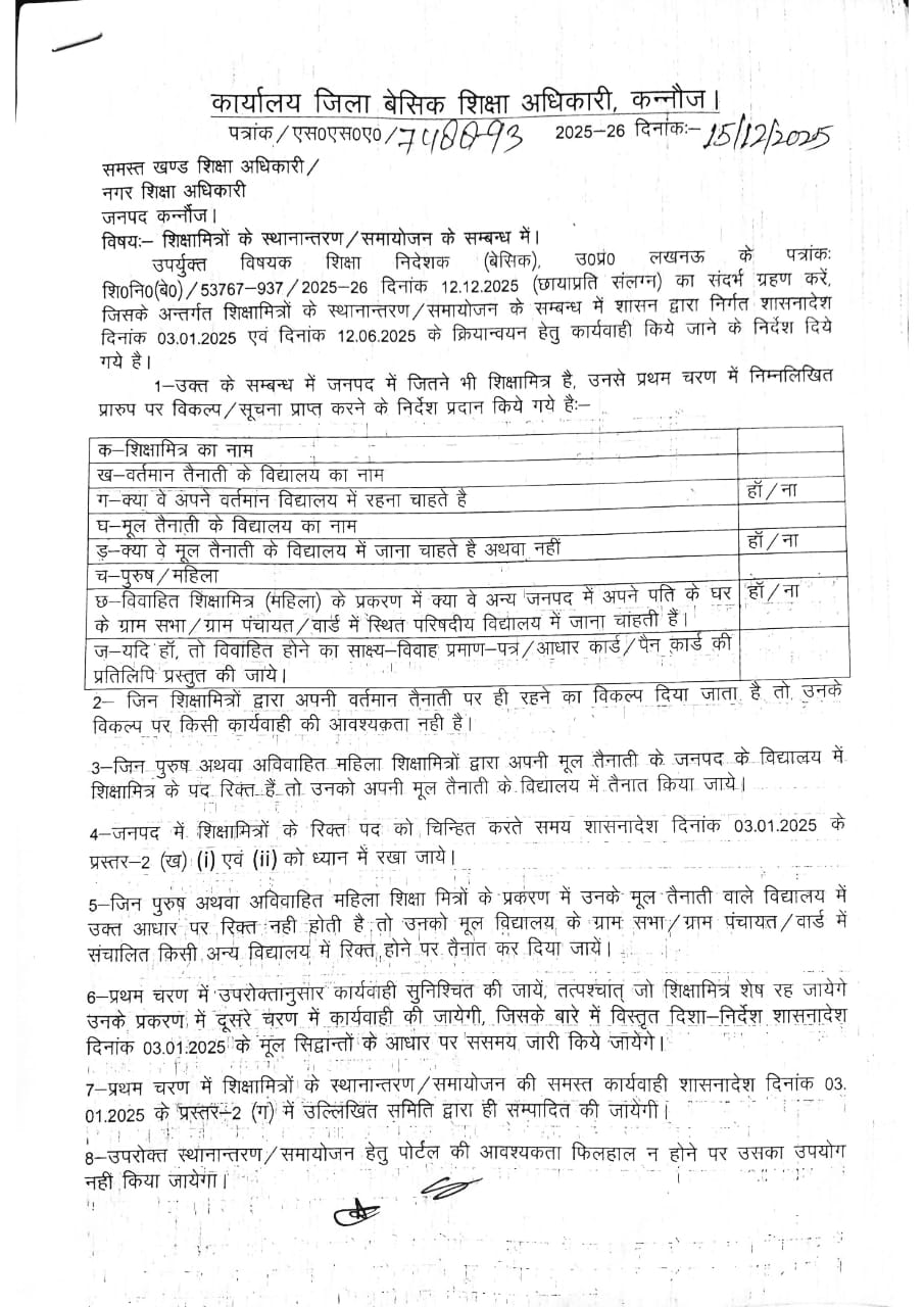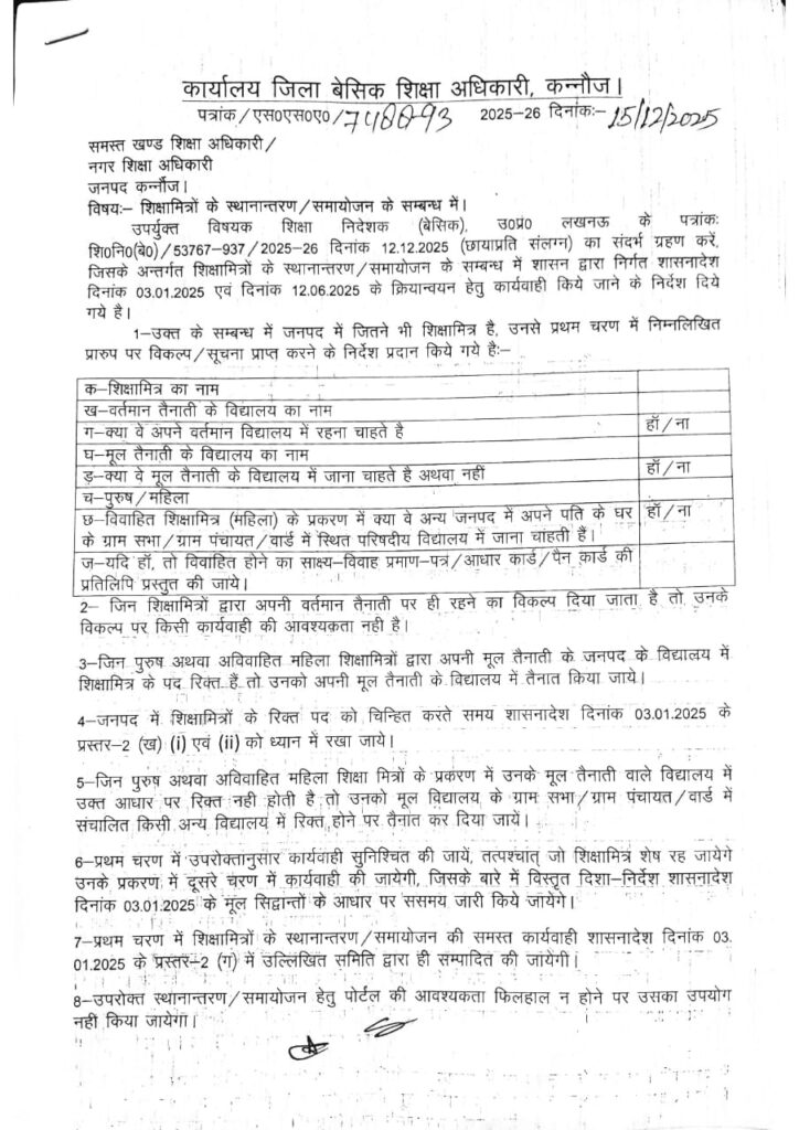 शिक्षामित्रों के स्थानांतरण / समायोजन के संबंध में आदेश जनपद : कन्नौज