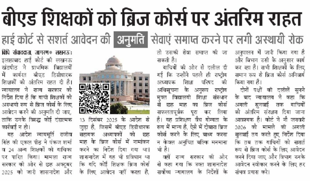 यह आदेश न्यायमूर्ति राजीव सिंह की एकल पीठ ने पंकज शर्मा व 24 अन्य शिक्षकों की याचिका पर पारित किया। मामला राज्य सरकार की ओर से छह अक्टूबर 2025 को जारी शासनादेश और 13 दिसंबर 2025 के आदेश से जुड़ा है, जिसमें बीएड डिग्रीधारक सहायक अध्यापकों को छह माह के ब्रिज कोर्स में नामांकन करने का निर्देश दिया गया था। शासनादेश में यह भी प्रविधान था