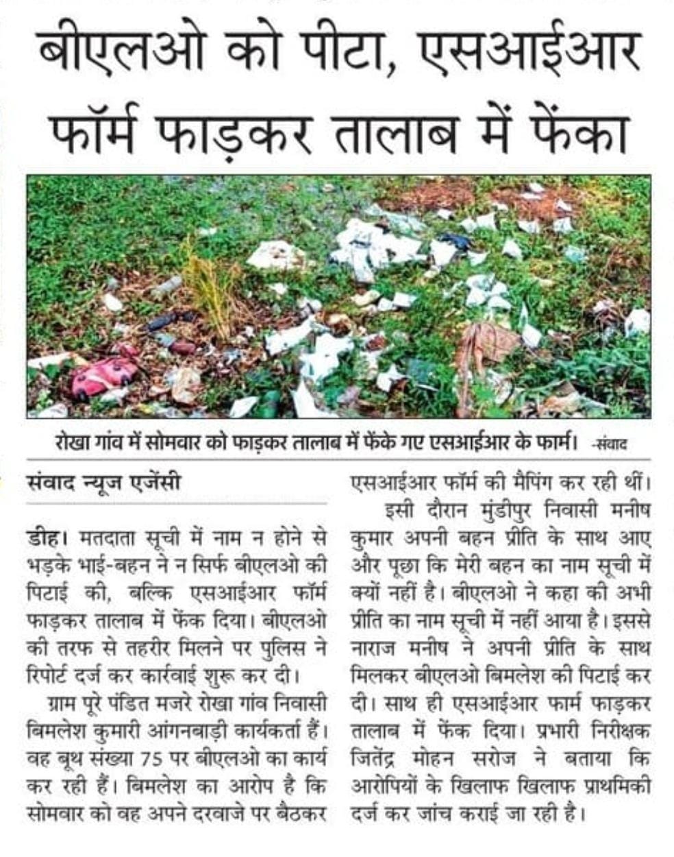 डीह। मतदाता सूची में नाम न होने से भड़के भाई-बहन ने न सिर्फ बीएलओ की पिटाई की, बल्कि एसआईआर फॉर्म फाड़कर तालाब में फेंक दिया। बीएलओ की तरफ से तहरीर मिलने पर पुलिस ने रिपोर्ट दर्ज कर कार्रवाई शुरू कर दी।