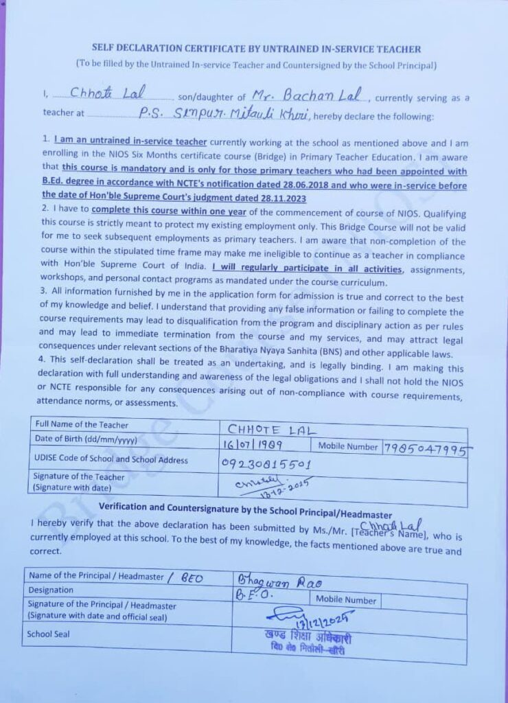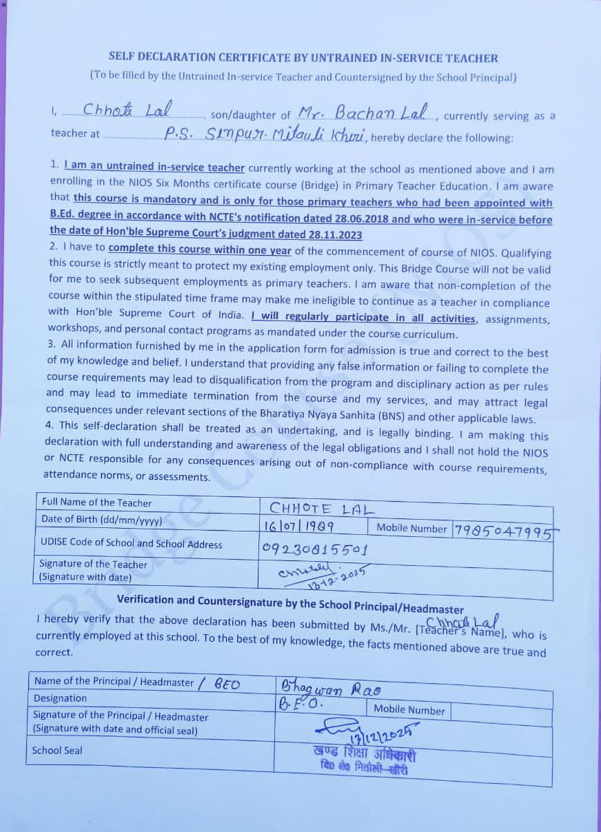 ब्रिज कोर्स आवेदन करते समय सेल्फ डिक्लेरेशन फॉर्म (अपने इंचार्ज या खंड शिक्षा अधिकारी से प्रमाणित करवाने के बाद)