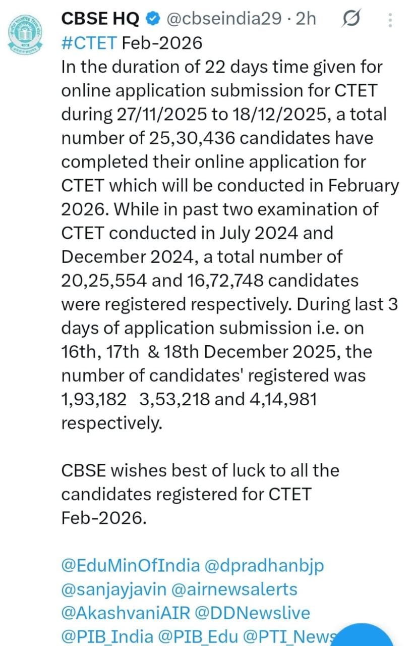CTET 2025 में कुल आवेदन की संख्या : 25,30,436 हैं,पिछले साल की तुलना में इस साल 5 लाख आवेदन अधिक हुए इसका कारण विभिन्न राज्यों के सेवारत शिक्षक भी आवेदन किये।