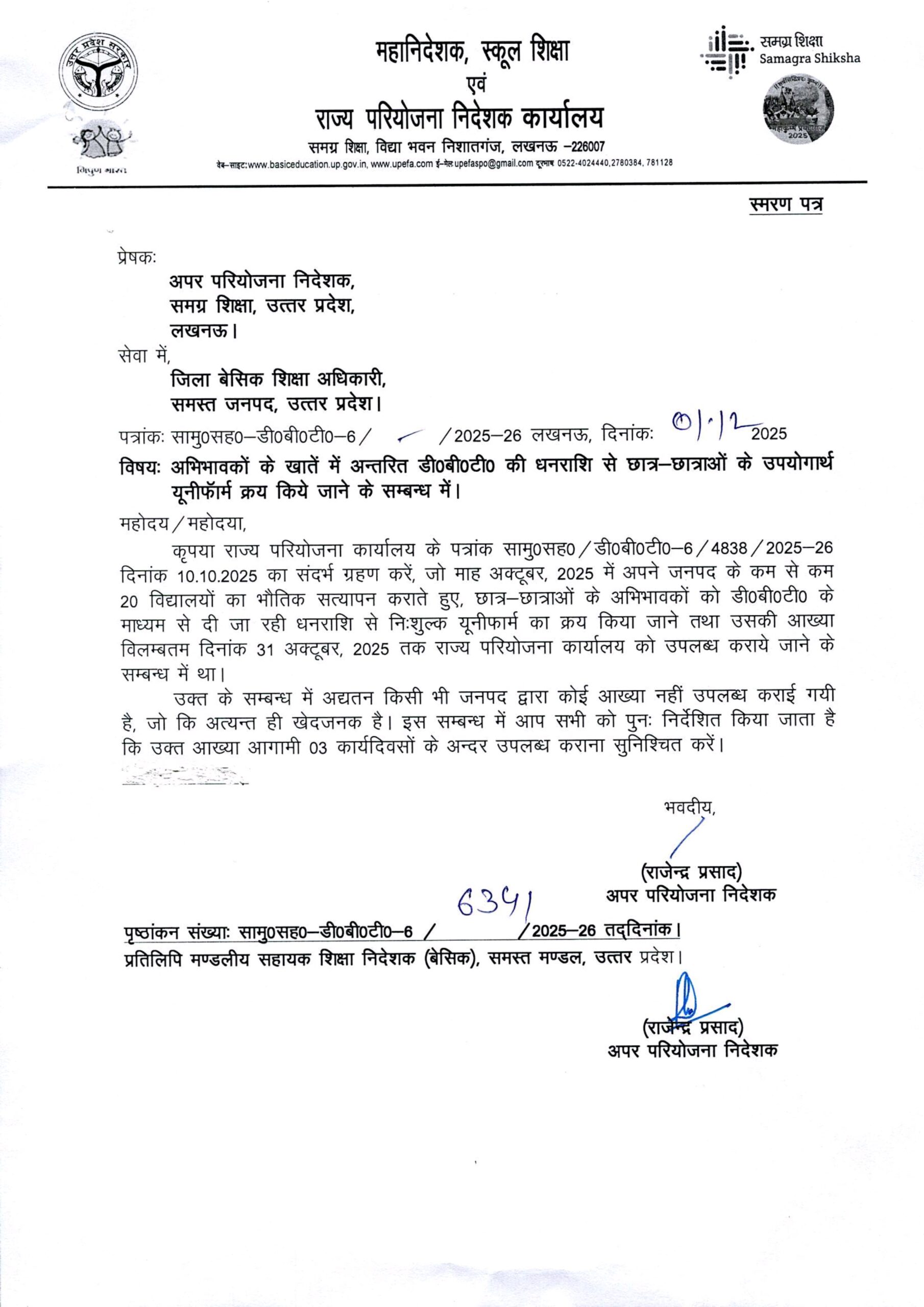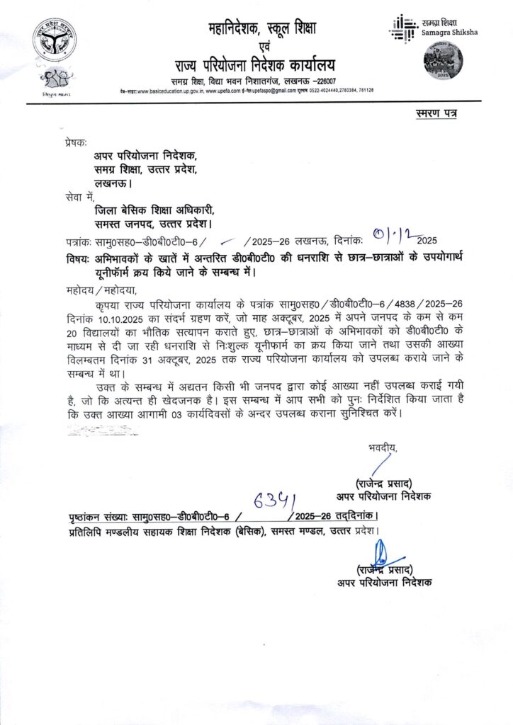 अभिभावकों के खातें में अन्तरित DBT की धनराशि से छात्र-छात्राओं के उपयोगार्थ यूनीफॉर्म क्रय किये जाने के सम्बन्ध में।