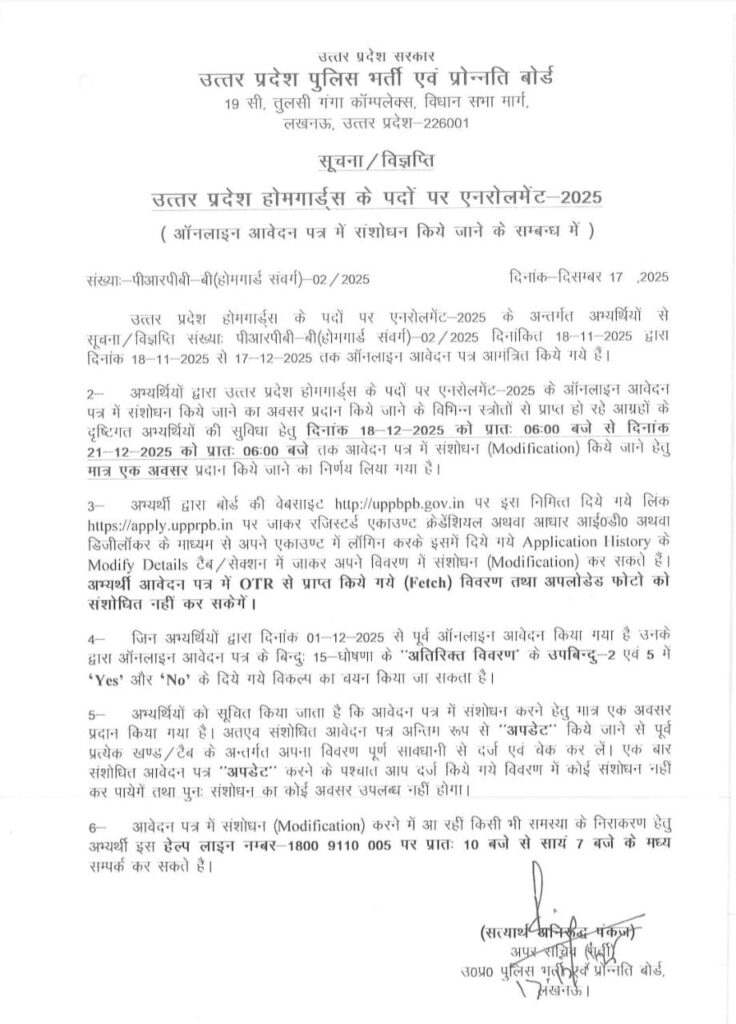 उत्तर प्रदेश होमगार्ड्स भर्ती 2025 आवेदन फॉर्म में संशोधन 18 से 21 दिसंबर तक कर सकते हैं
