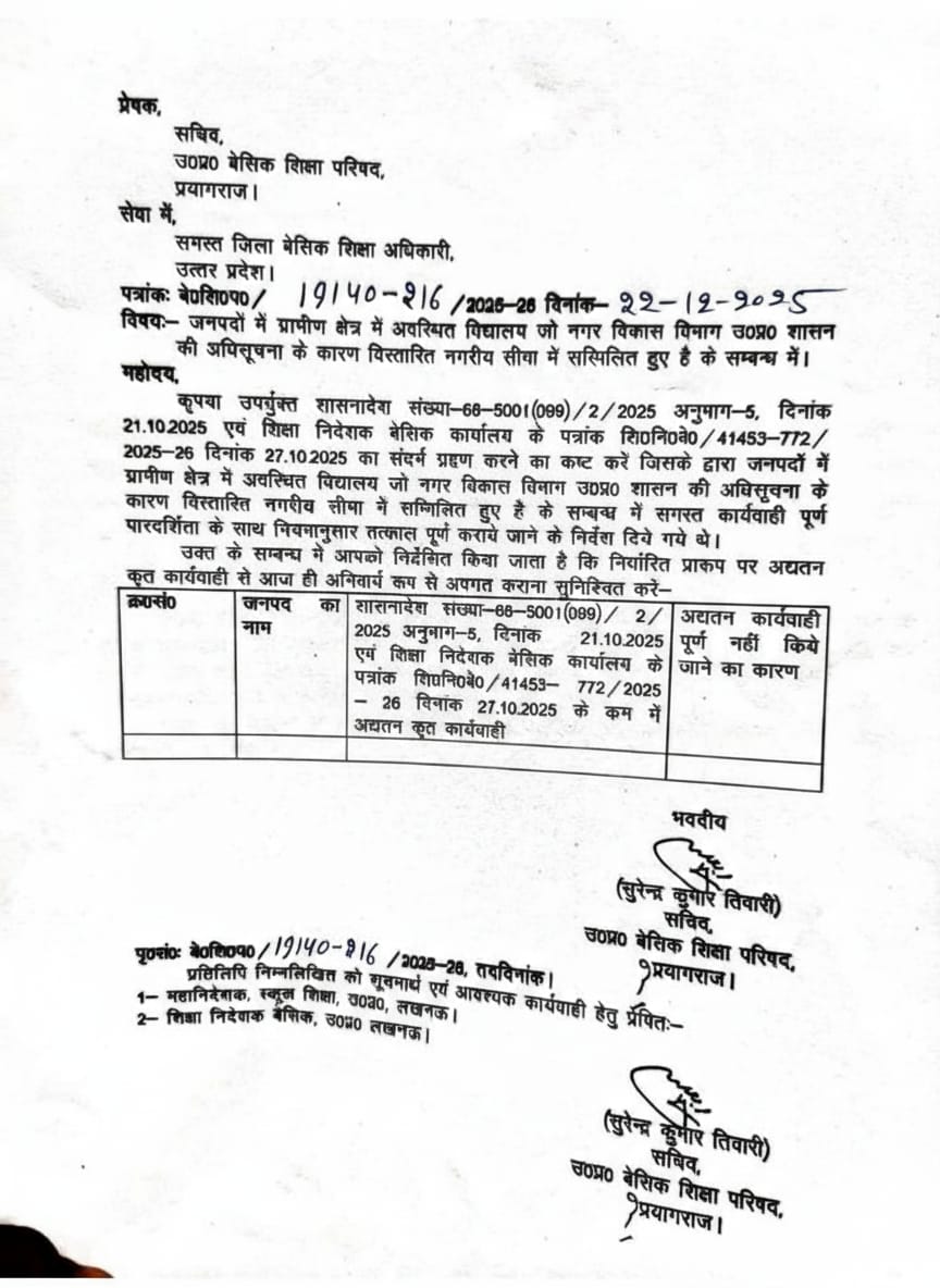 जनपदों के ग्रामीण क्षेत्र में अवस्थित विद्यालय जो नगर विकास विभाग उत्तर प्रदेश शासन की अधिसूचना के कारण विस्तारित नगरीय सीमा में शामिल हुए, उनकी सूचना उपलब्ध कराने के संबंध में