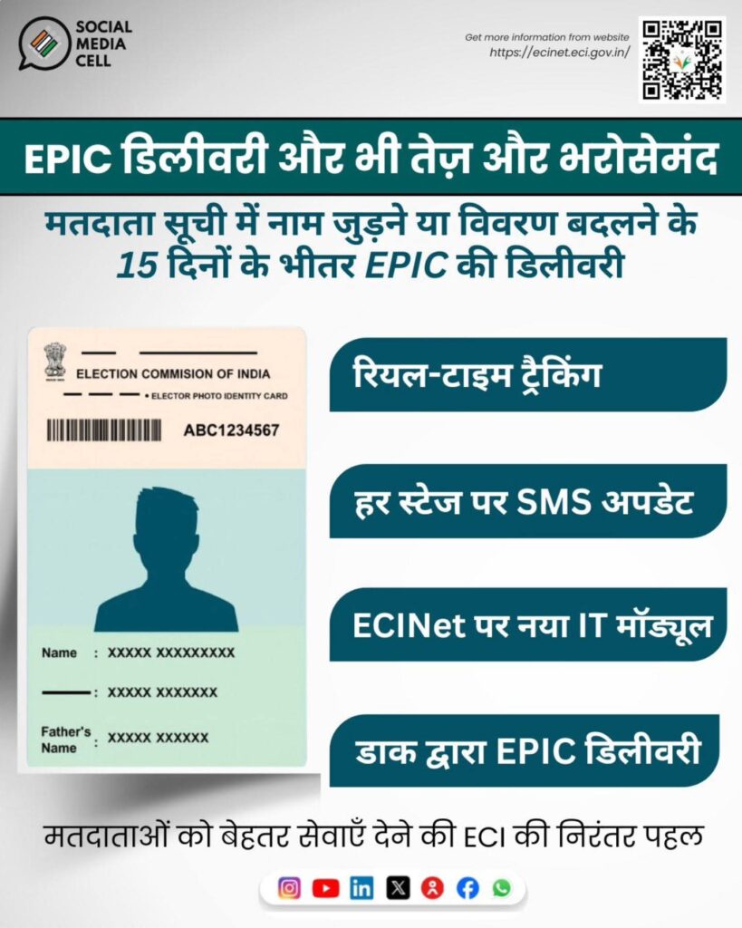 मतदाताओं को बेहतर सेवाएँ देने की #ECI की निरंतर पहल अब सिर्फ 15 दिनों में EPIC की डिलीवरी, तेज़ → सुरक्षित → सुविधाजनक