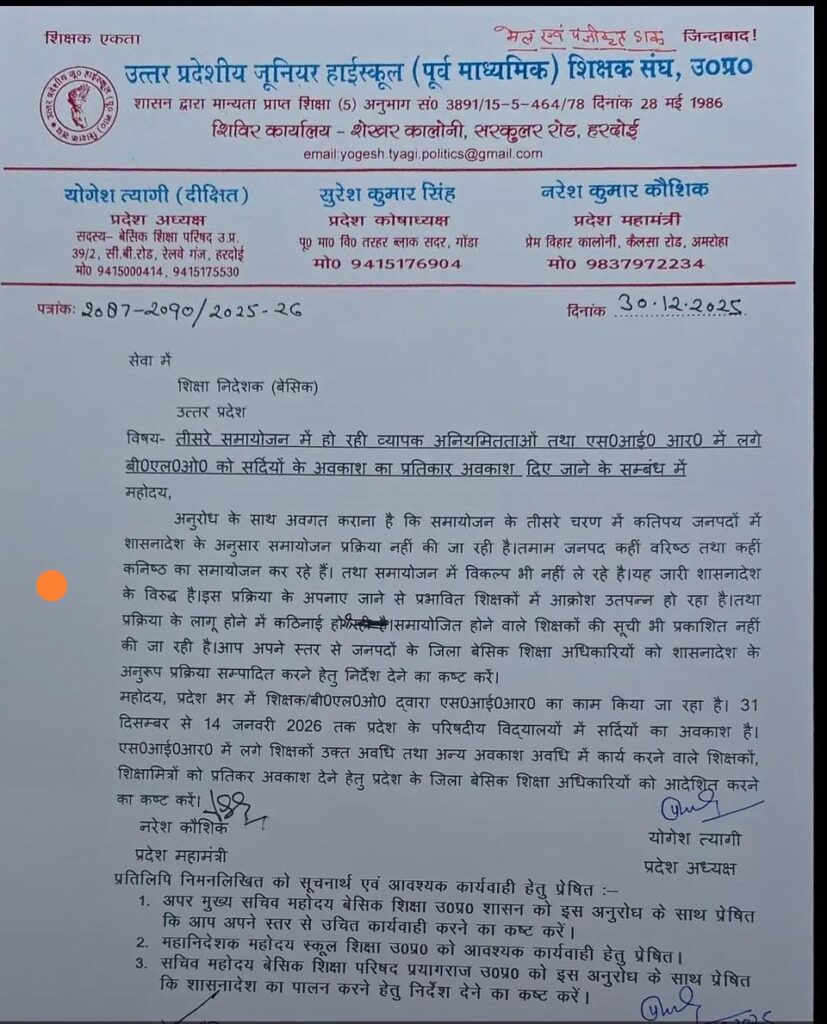 समायोजन/ स्थानांतरण 3.0 में अनियमितता तथा SIR कार्य करने वालों शिक्षक, शिक्षा मित्र /अनुदेशक को प्रतिकर अवकाश के संबंध में शिक्षा निदेशक बेसिक को मांग पत्र☝️