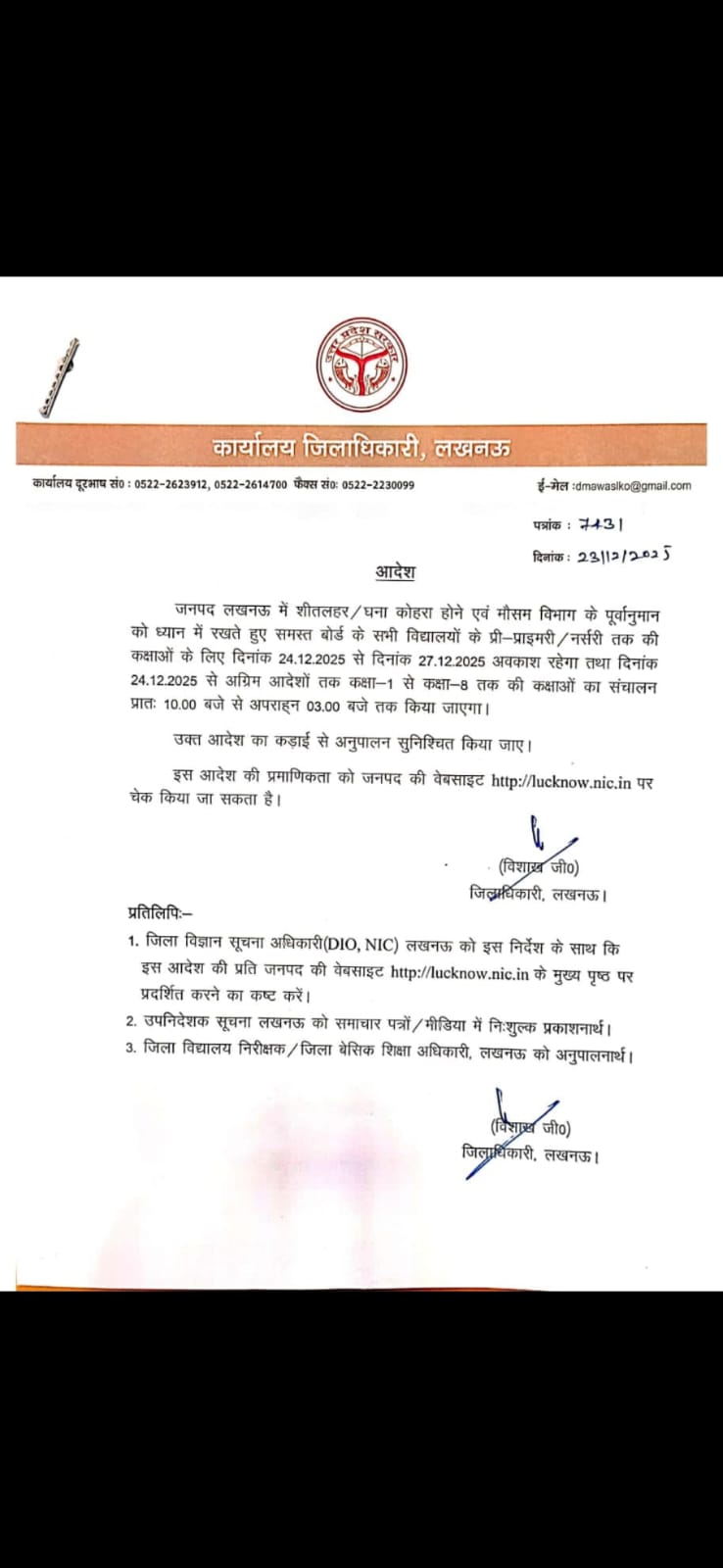 दिनांक 26 दिसंबर 2025 तक विद्यालय में पठन-पाठन स्थगित किए जाने के संबंध में