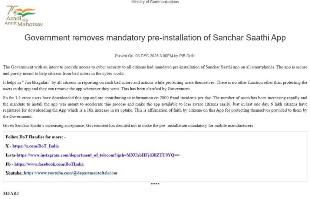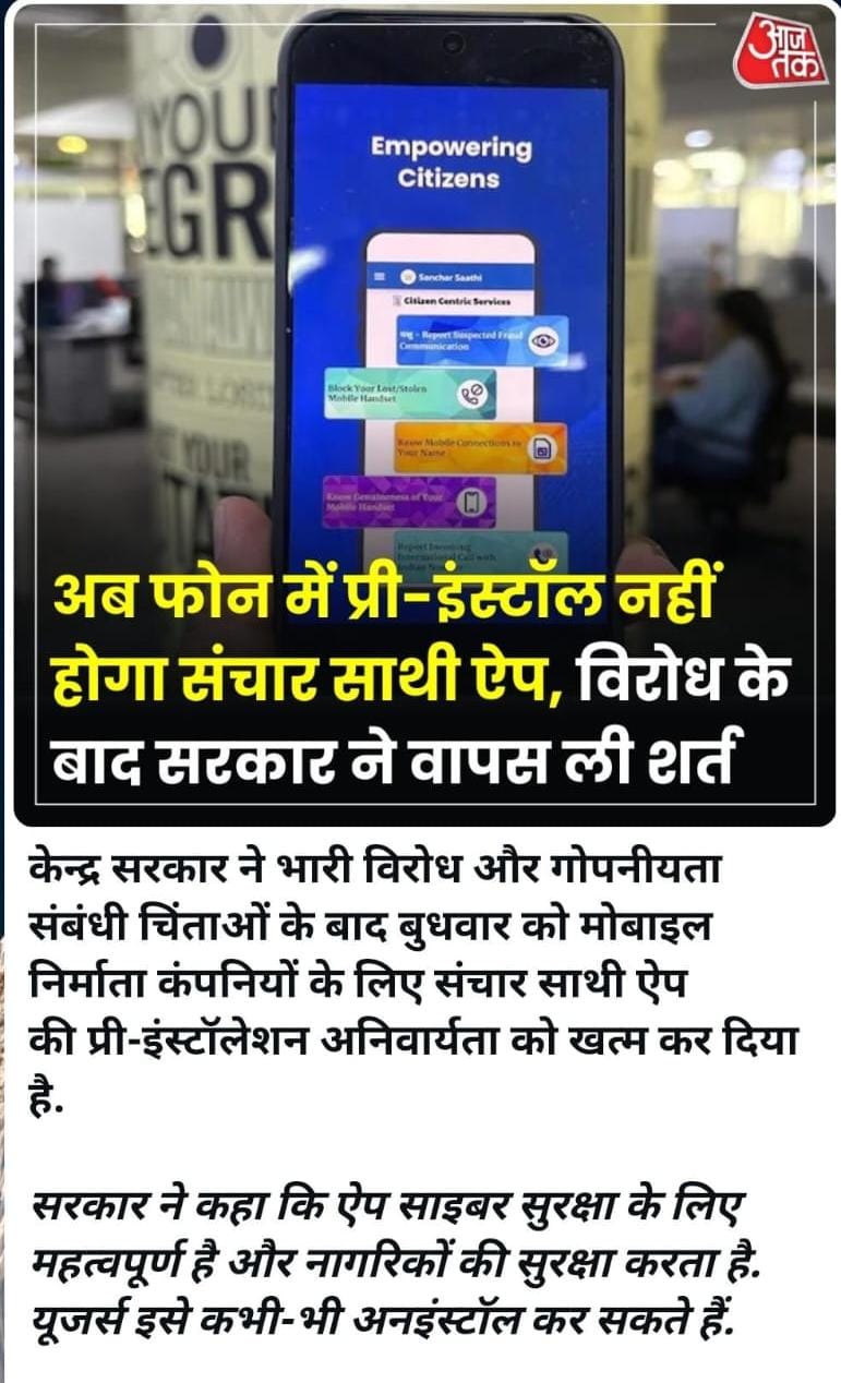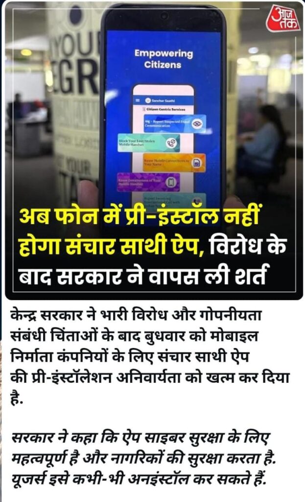 Home PRIMARY KA MASTER NEWS अब फोन में प्री-इंस्टॉल नहीं होगा संचार साथी ऐप, विरोध के बाद सरकार ने वापस ली शर्त