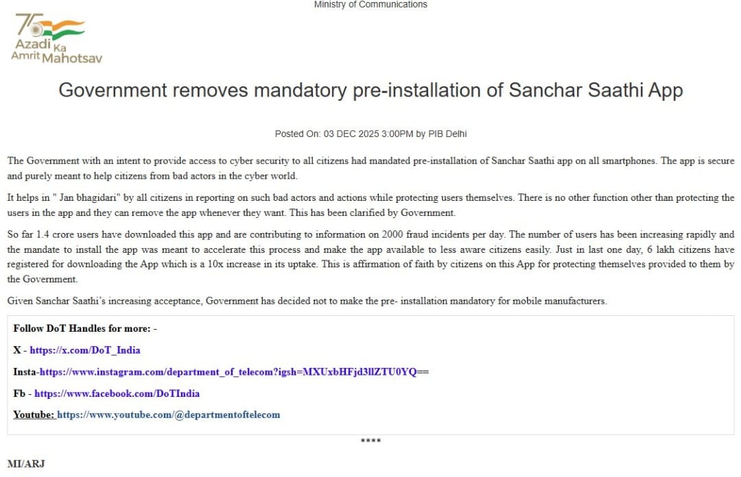 अब फोन में प्री-इंस्टॉल नहीं होगा संचार साथी ऐप, विरोध के बाद सरकार ने वापस ली शर्त