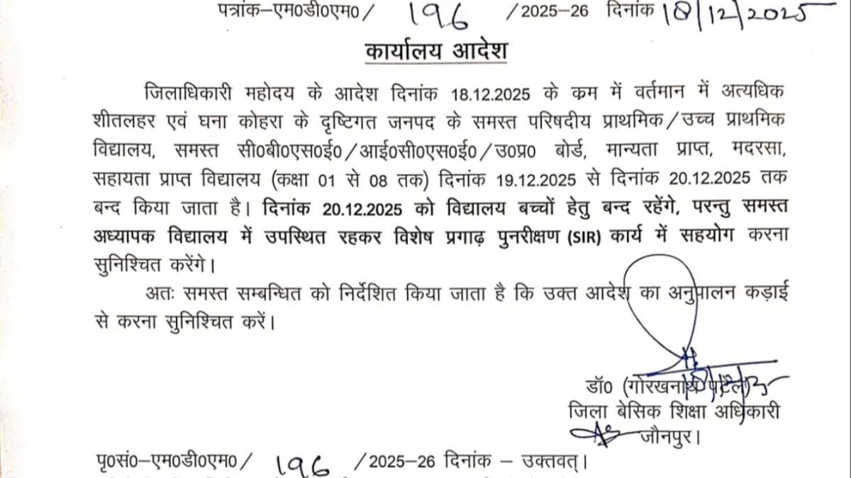 अत्यधिक शीतलहर एवं घने कोहरे के कारण 19 दिसंबर को शिक्षकों एवं बच्चों एवं 20 दिसंबर को विद्यालय बच्चों हेतु बंद