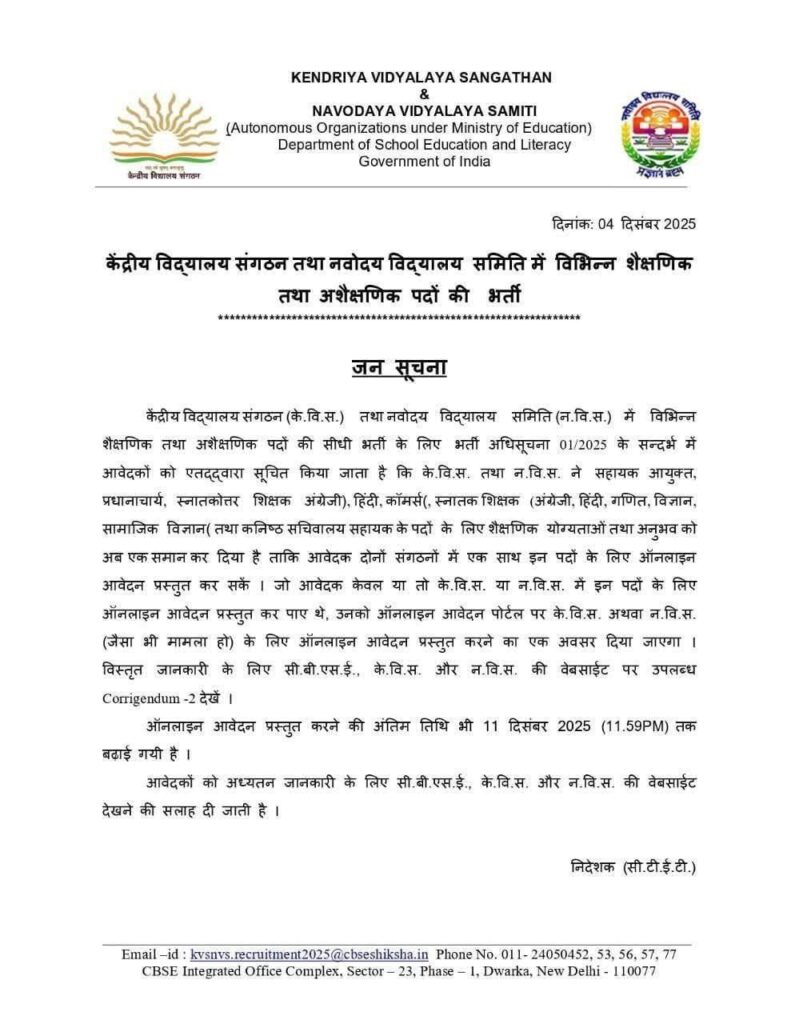 इससे उम्मीदवार इन पदों के लिए दोनों विभागों (KVS और NVS) में एक साथ ऑनलाइन आवेदन कर सकेंगे।
