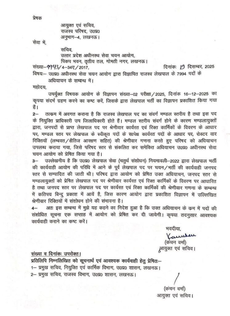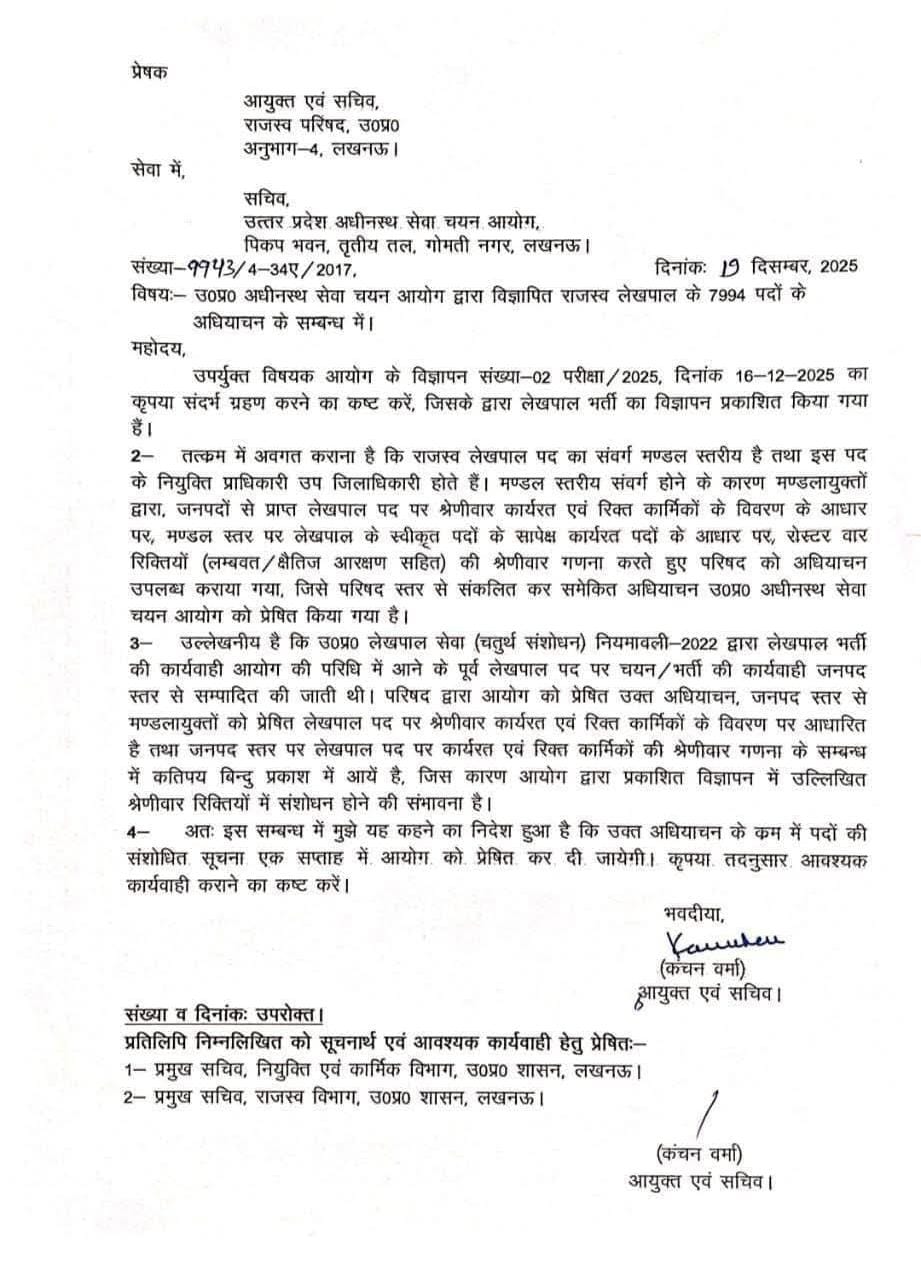 उ०प्र० अधीनस्थ सेवा चयन आयोग द्वारा विज्ञापित राजस्व लेखपाल के 7994 पदों के अधियाचन के सम्बन्ध में।