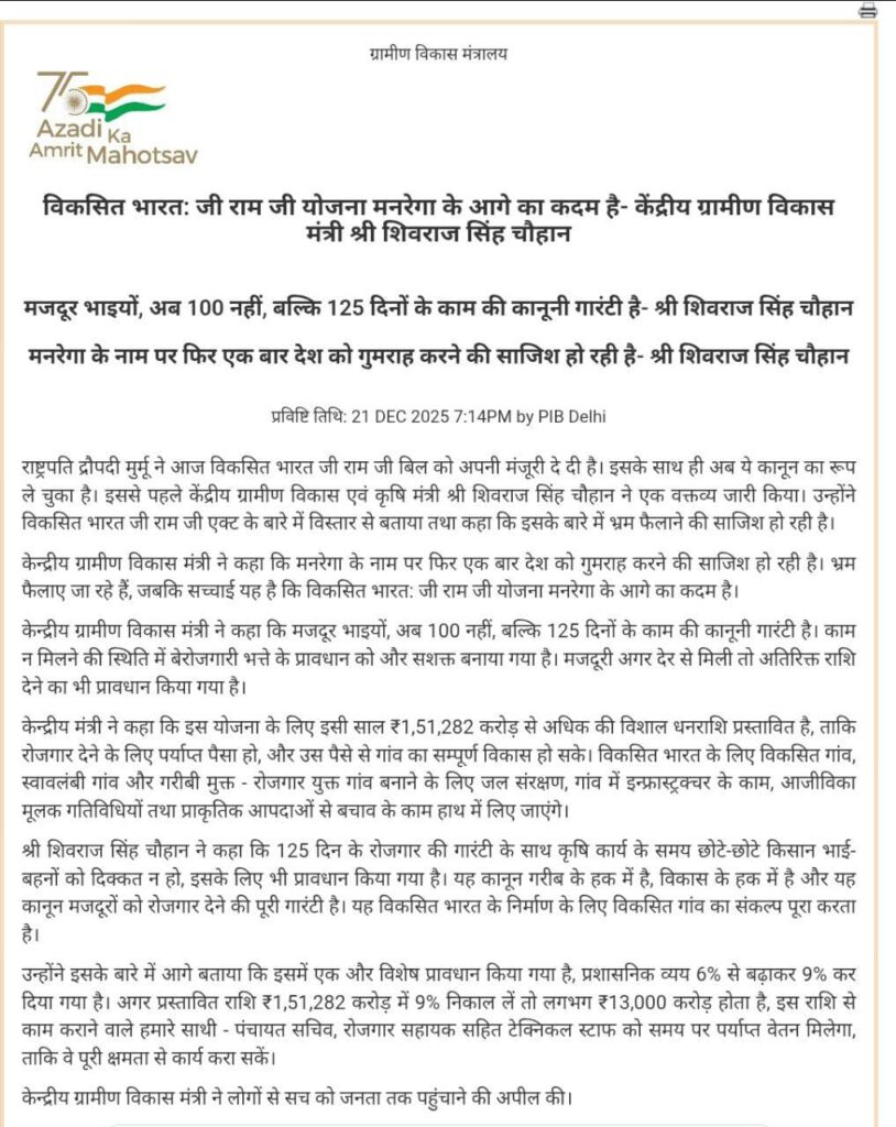 जी राम जी से 125 दिन का रोजगार तय, राष्ट्रपति की मुहर लगते ही नया कानून लागू: मनरेगा की जगह ग्रामीण रोजगार का नया मॉडल