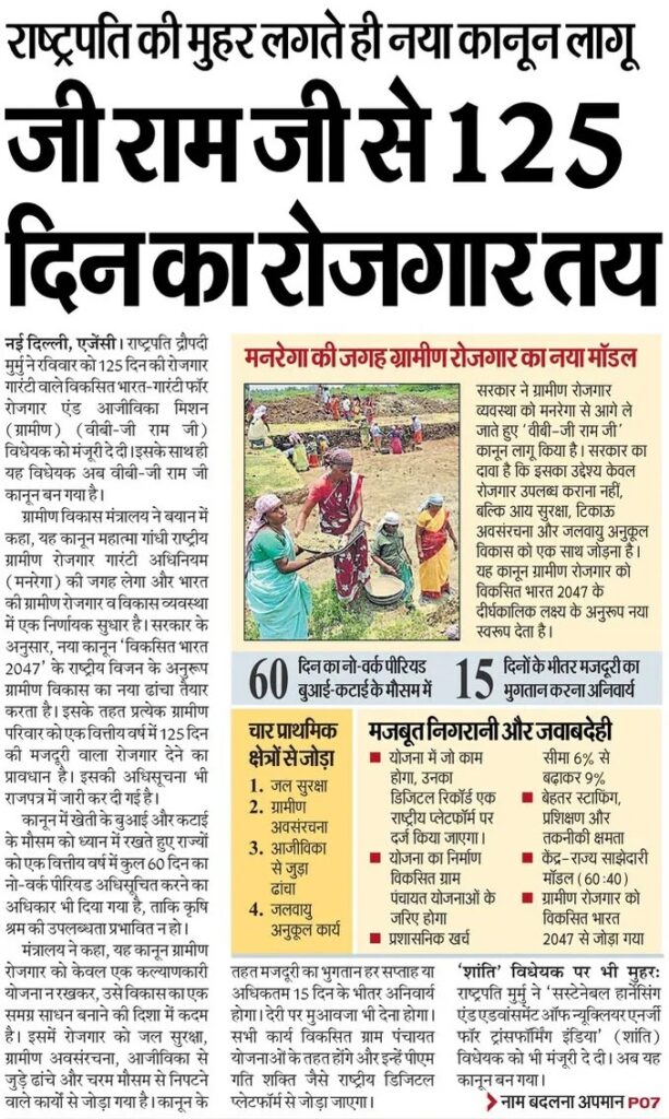 तहत मजदूरी का भुगतान हर सप्ताह या अधिकतम 15 दिन के भीतर अनिवार्य होगा। देरी पर मुआवजा भी देना होगा। सभी कार्य विकसित ग्राम पंचायत योजनाओं के तहत होंगे और इन्हें पीएम गति शक्ति जैसे राष्ट्रीय डिजिटल प्लेटफॉर्म से जोड़ा जाएगा। ‘शांति’ विधेयक पर भी मुहरः राष्ट्रपति मुर्मु ने ‘सस्टेनेबल हानेंसिंग एंड एडवांसमेंट ऑफ न्यूक्लियर एनर्जी फॉर ट्रांसफॉर्मिंग इंडिया’ (शांति) विधेयक को भी मंजूरी दे दी। अब यह कानून बन गया
