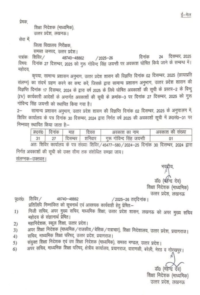 माध्यमिक शिक्षा निदेशक का आदेश: दिनांक 27 दिसंबर 2025 को गुरु गोविंद सिंह जयंती पर अवकाश घोषित किए जाने के संबंध