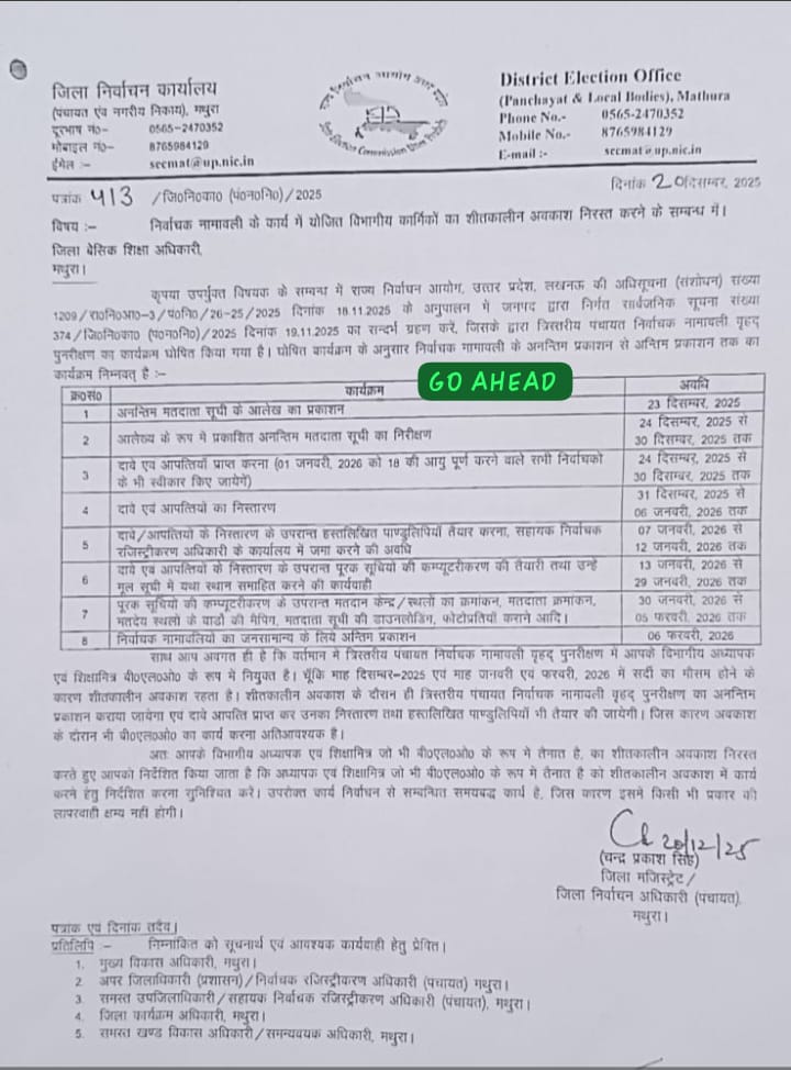 Home PRIMARY KA MASTER NEWS जिले में निर्वाचन नामावली के कार्य में योजित विभागीय कार्मिकों का शीतकालीन अवकाश निरस्त करने के संबंध में