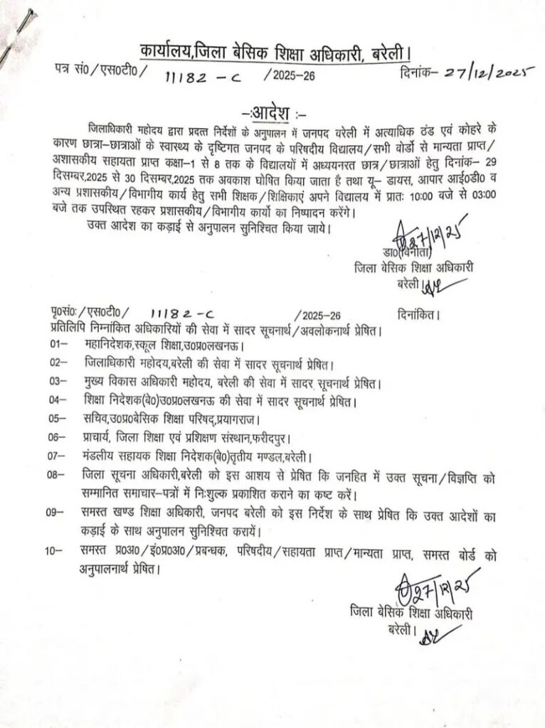 अवकाश सूचना: इस जिले में 29-30 दिसम्बर को रहेगा अवकाश, बीएसए साहब का आदेश जारी