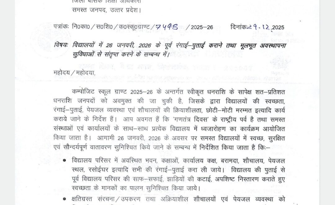 विद्यालयों में 26 जनवरी, 2026 के पूर्व रंगाई-पुताई कराने तथा मूलभूत अवस्थापना सुविधाओं से संतृप्त करने के सम्बन्ध में। महोदय/महोदया, कम्पोजिट स्कूल ग्राण्ट 2025-26 के अन्तर्गत स्वीकृत धनराशि के सापेक्ष … Continue reading विद्यालयों में 26 जनवरी, 2026 के पूर्व रंगाई-पुताई कराने तथा मूलभूत अवस्थापना सुविधाओं से संतृप्त करने के सम्बन्ध में