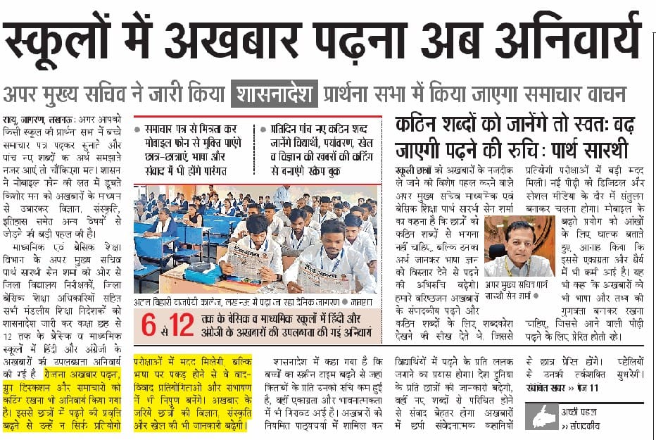 Primary ka master :  स्कूलों में अखबार पढ़ना अब अनिवार्य, अपर मुख्य सचिव ने जारी किया शासनादेश प्रार्थना सभा में किया जाएगा समाचार वाचन