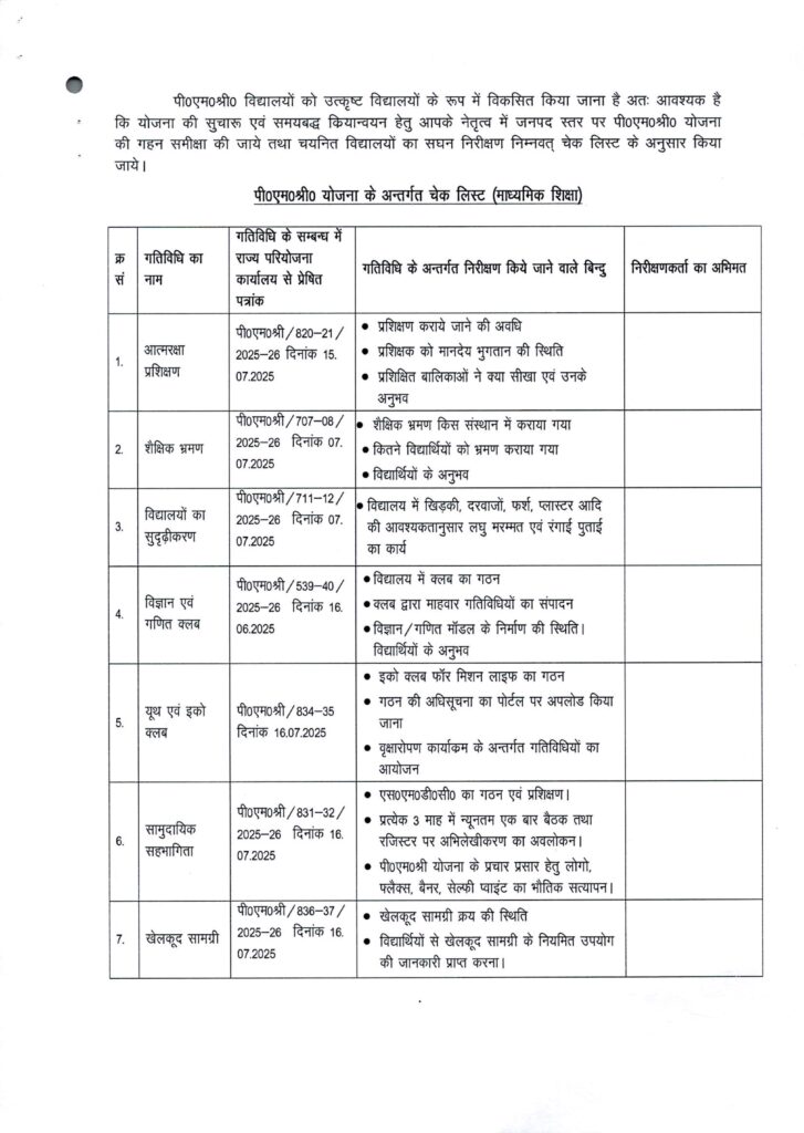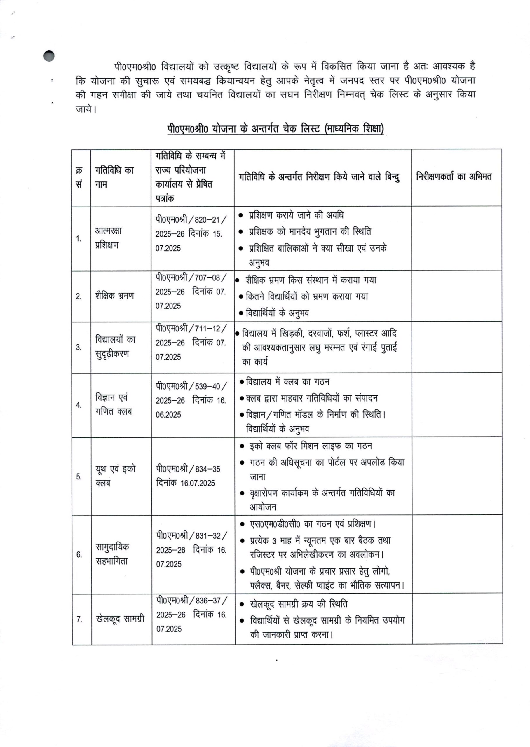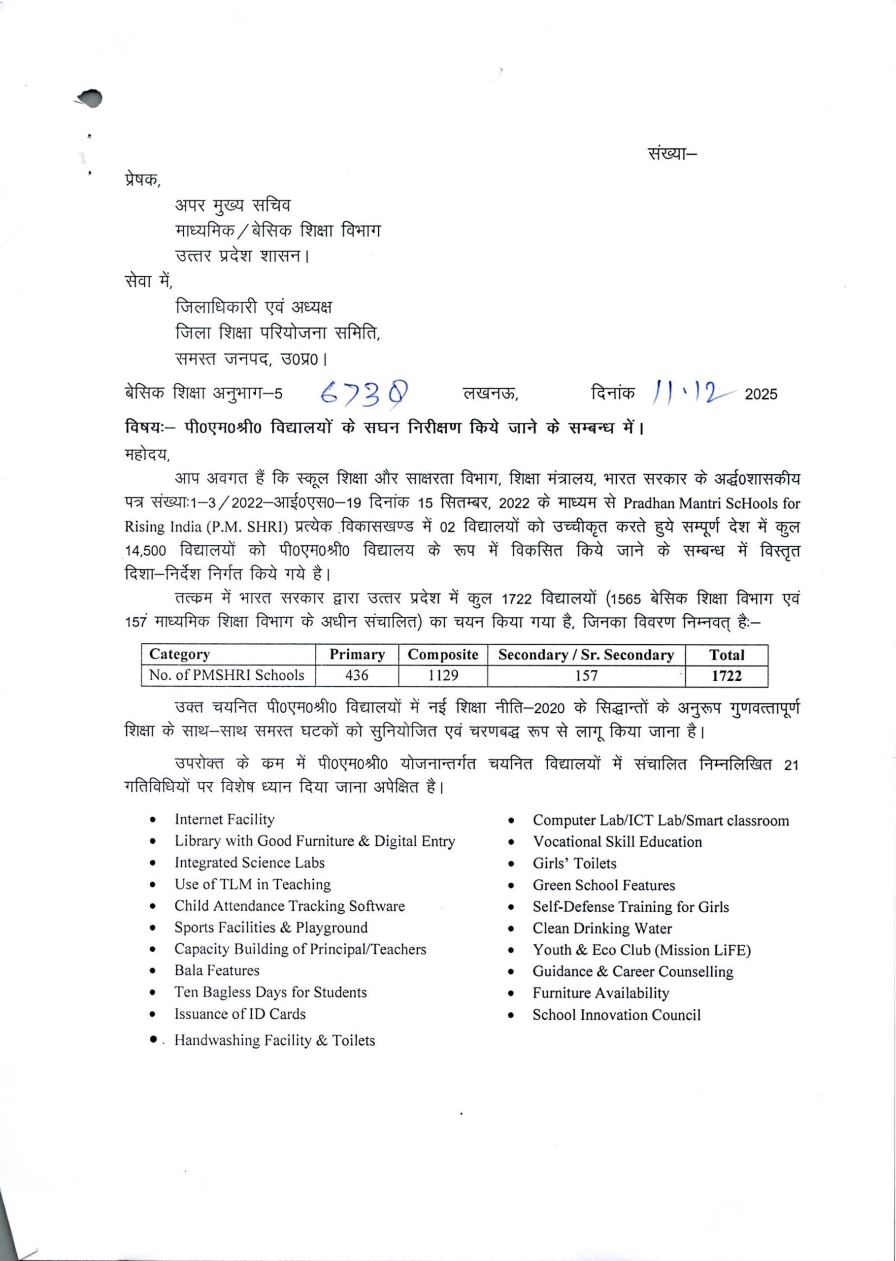 PM shri school : पी0एम0श्री0 विद्यालयों के सघन निरीक्षण किये जाने के सम्बन्ध में।