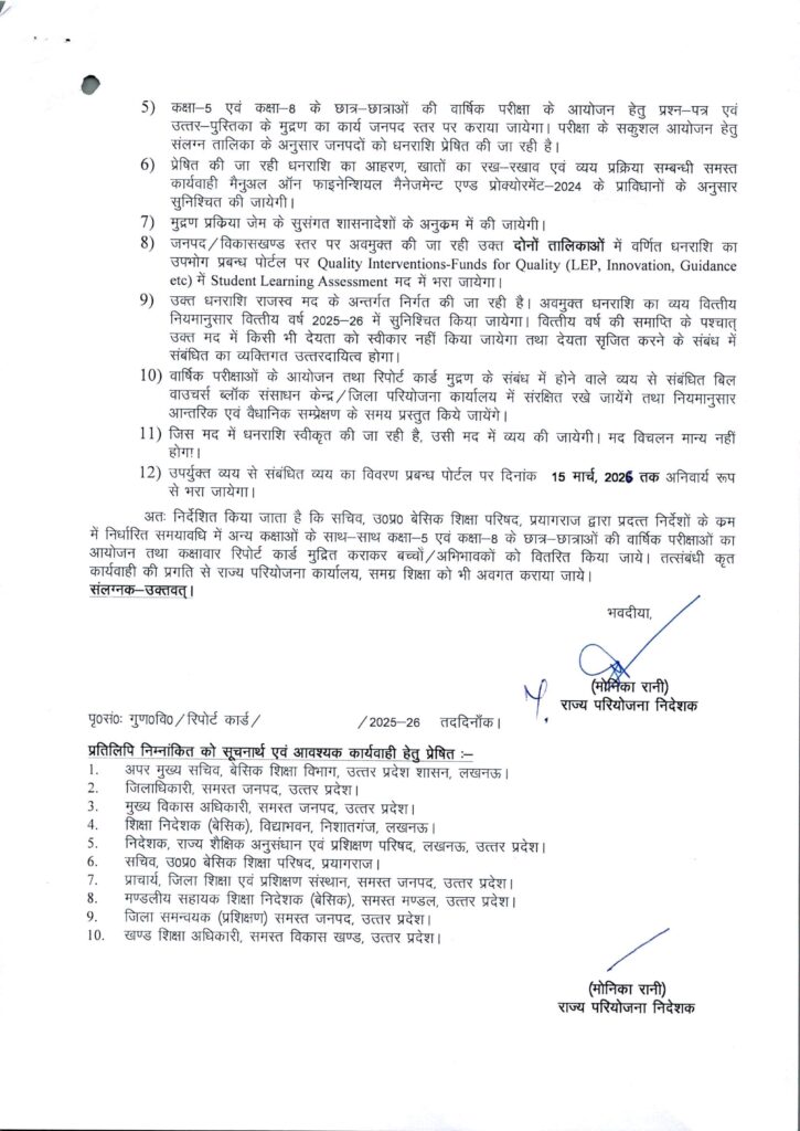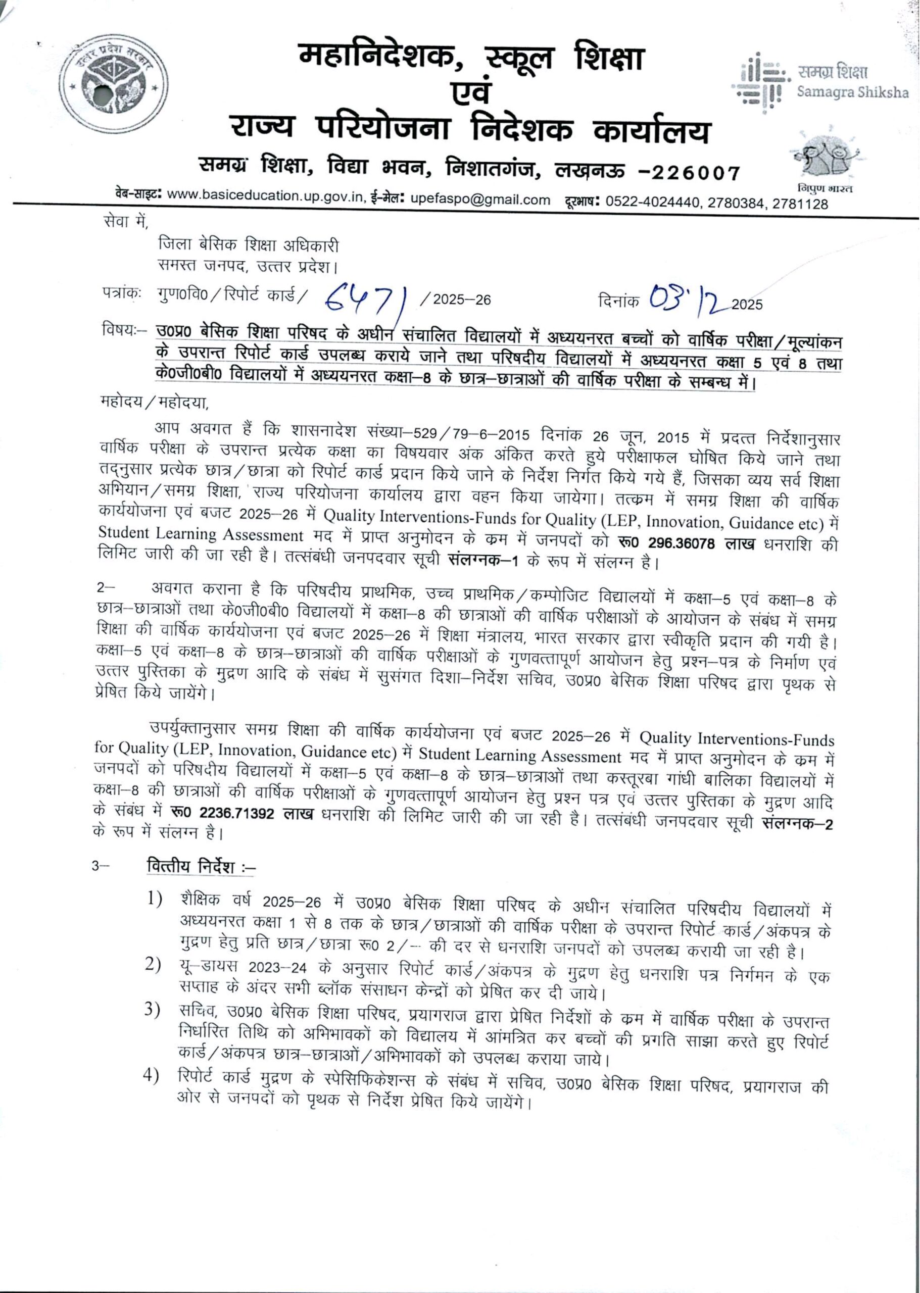 उ0प्र0 बेसिक शिक्षा परिषद के अधीन संचालित विद्यालयों में अध्ययनरत बच्चों को वार्षिक परीक्षा/मूल्यांकन के उपरान्त रिपोर्ट कार्ड उपलब्ध कराये जाने तथा परिषदीय विद्यालयों में अध्ययनरत कक्षा 5 एवं 8 तथा के0जी0बी0 विद्यालयों में अध्ययनरत कक्षा-8 के छात्र-छात्राओं की वार्षिक परीक्षा के सम्बन्ध में।