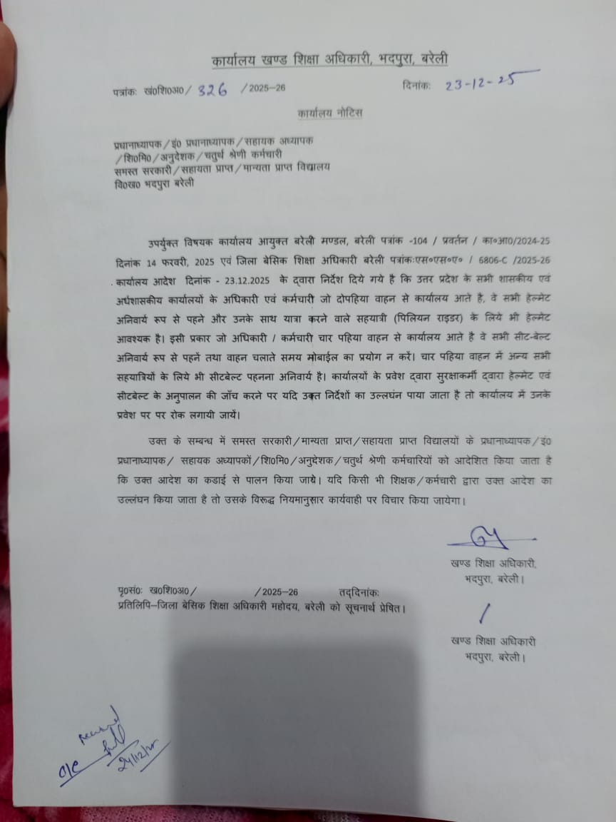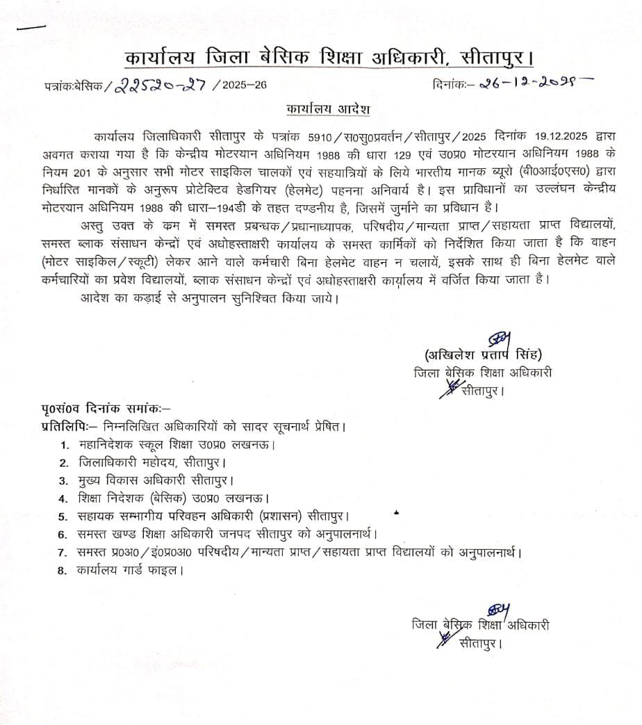 सीतापुर:* समस्त कार्मिकों को निर्देशित किया जाता है कि वाहन (मोटर साइकिल / स्कूटी) लेकर आने वाले कर्मचारी *बिना हेलमेट वाहन न चलायें,* इसके साथ ही *बिना हेलमेट वाले कर्मचारियों का प्रवेश विद्यालयों, ब्लाक संसाधन केन्द्रों एवं अधोहस्ताक्षरी कार्यालय में वर्जित किया जाता है।