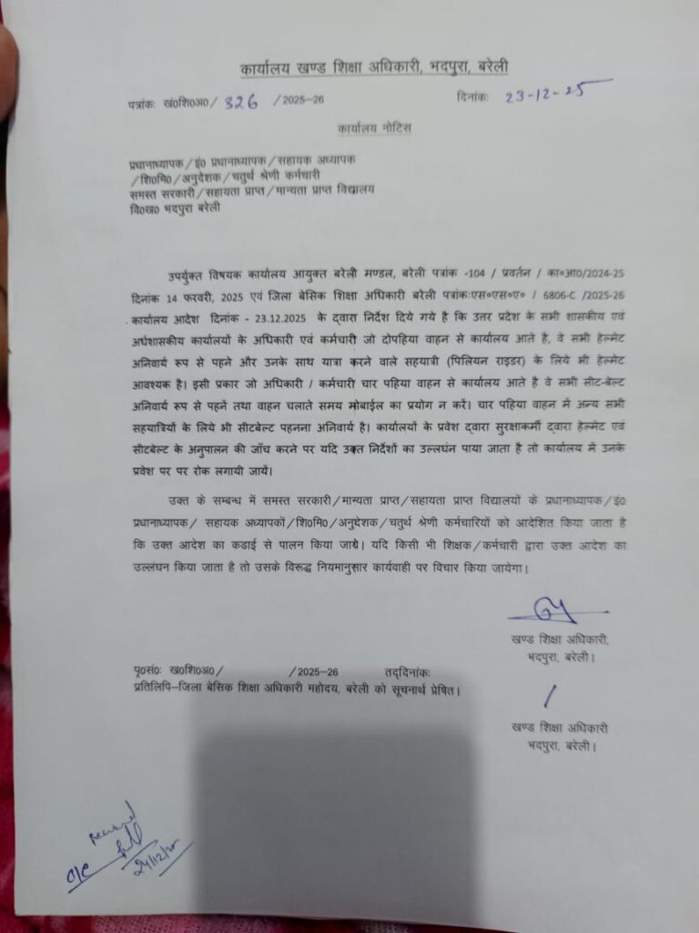 Primary ka master : बिना हेलमेट आने वाले कर्मचारियों का विद्यालय, बीआरसी व कार्यालय में प्रवेश प्रतिबंधित: आर्डर ए बेसिक शिक्षा