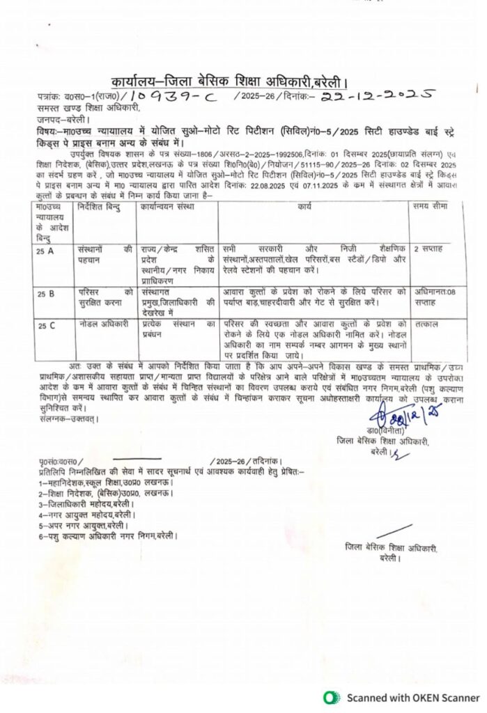 बरेली, उच्च न्यायालय में योजित सुओ-मोटो रिट पिटीशन सिटी हाउंडेड बाई स्ट्रे किड्स पे प्राइस बनाम अन्य में जारी आदेशों के अनुपालन में जिले के सभी शैक्षणिक संस्थानों में आवारा कुत्तों के प्रबंधन को निर्देश जारी किए गए हैं। बीएसए डॉ. विनीता ने सभी खंड शिक्षा अधिकारियों को पत्र लिखकर निर्देशित किया है कि वे अपने-अपने विकास खंड के अंतर्गत आने वाले सभी प्राथमिक, उच्च प्राथमिक, अशासकीय सहायता प्राप्त एवं मान्यता प्राप्त विद्यालयों की पहचान कर उनका विवरण उपलब्ध कराएं।