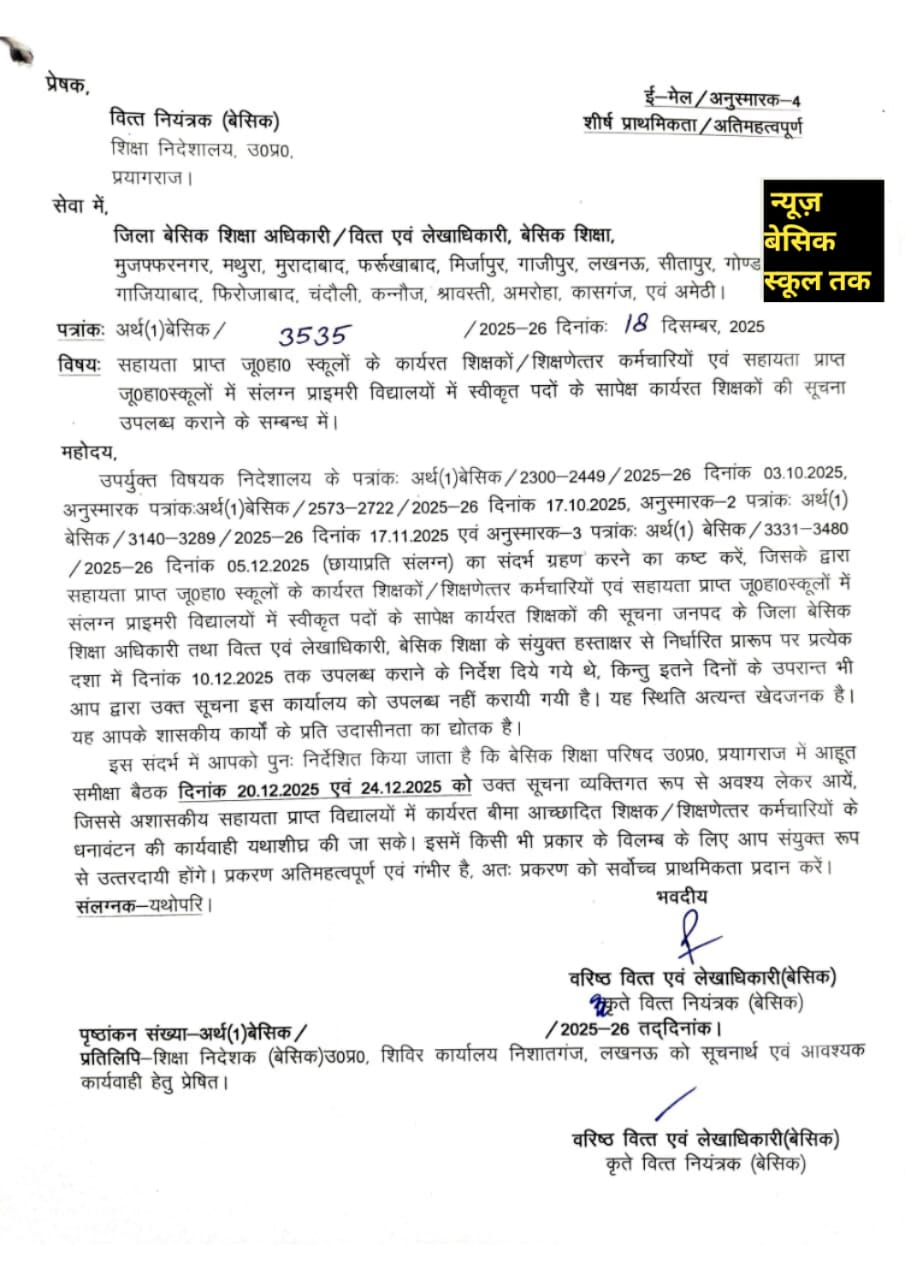 सहायता प्राप्त जू0हा0 स्कूलों के कार्यरत शिक्षकों/शिक्षणेत्तर कर्मचारियों एवं सहायता प्राप्त जू0हा0स्कूलों में संलग्न प्राइमरी विद्यालयों में स्वीकृत पदों के सापेक्ष कार्यरत शिक्षकों की सूचना उपलब्ध कराने के सम्बन्ध में।👆