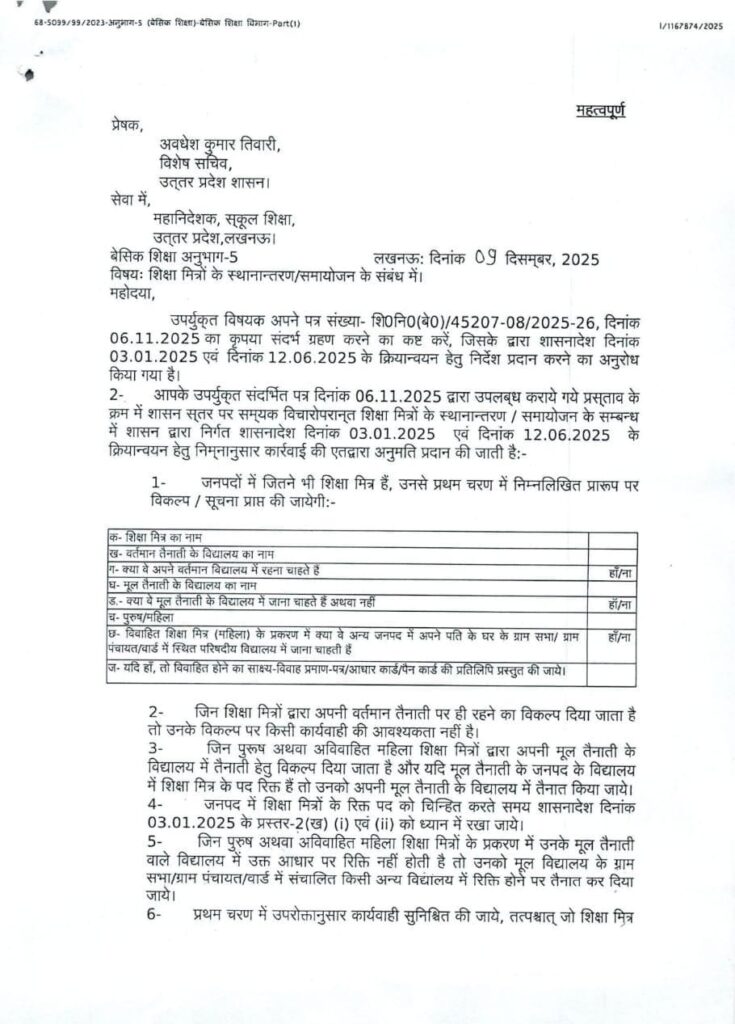 Home शिक्षा मित्र शिक्षामित्रों के स्थानान्तरण/समायोजन के संबंध में सचिव को सचिव का शासनादेश जारी