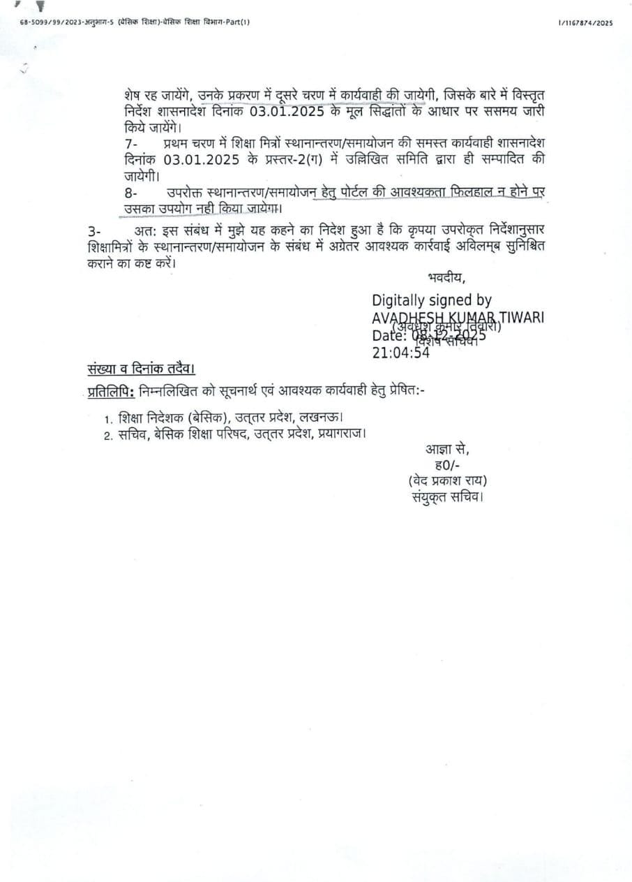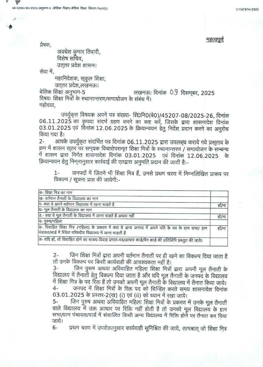 शिक्षामित्रों के स्थानान्तरण/समायोजन के संबंध में सचिव को सचिव का शासनादेश जारी